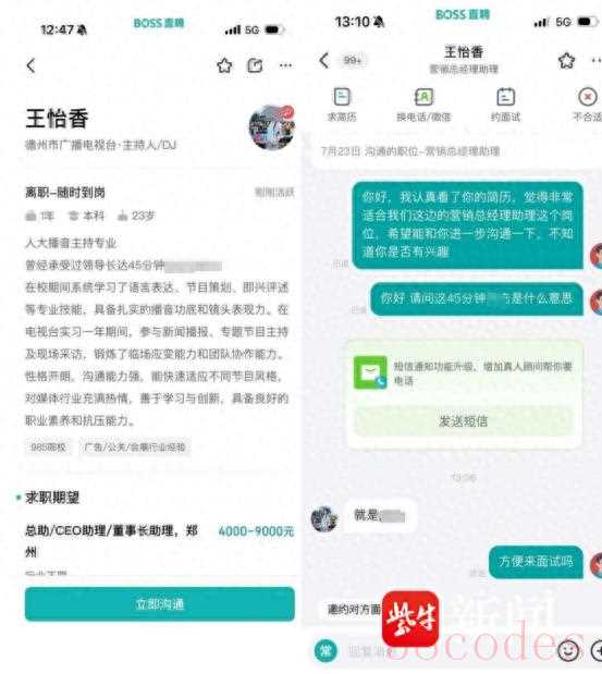网传群聊记录显示,7月23日下午,有人发布了两张BOSS直聘上的信息截图。其中一张截图显示,一名自称“王某香”的23岁女性求职者,在简历中标注“本科学历、曾为山东省德州市广播电视台主持人(已离职)”,求职岗位为董事长助理。简历附带一张身着浅蓝色上衣的女性照片,个人介绍中存在暗示与领导发生不正当关系的内容;另一张截图则显示,该账号在回复招聘方时,明确承认上述暗示指向性关系。