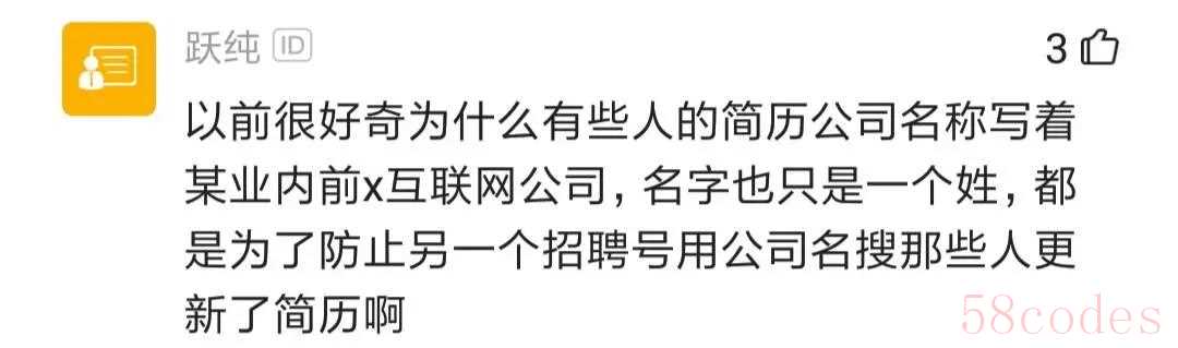 没想到这些公司私下里竟然有这些骚操作,一网友恍然大悟,难怪以前看到有些人的简历里公司名称写着某业内前xx互联网公司,名字也只是一个姓,原来是为了防止被现公司发现更新简历。更多精彩微信搜索程序员八卦。