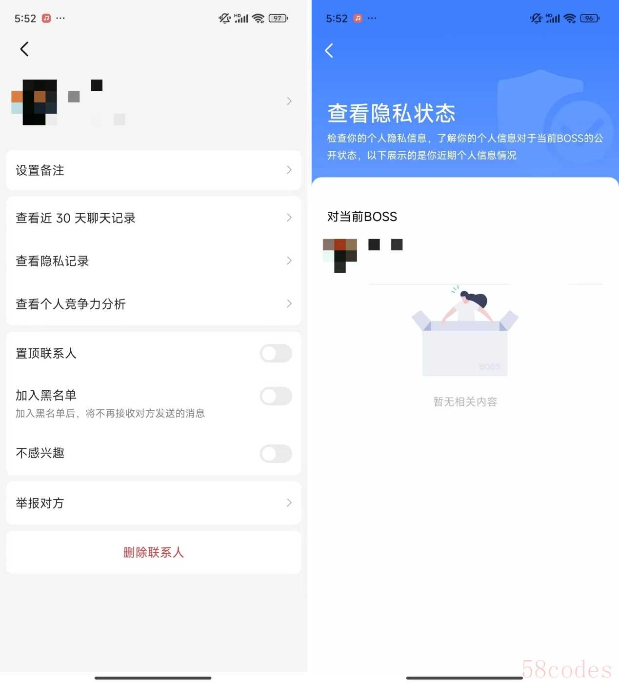 最后,求职者可以自行管理招聘者的查看权限,如果选择“对BOSS隐藏简历”,求职者的简历将不会在招聘者的推荐列表里出现。在与单个招聘者沟通时,求职者可以随时点开其主页,查看隐私记录,了解个人信息对于当前招聘者的公开状态。