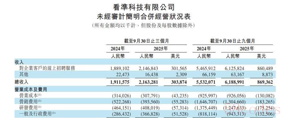 其次,BOSS直聘利润高速增长,一个重要因素是成本的优化。财报显示,今年三季度,BOSS直聘一般及行政费用、研发费用、营销费用为14.76亿元,对比2024年同期的15.87亿元减少了7.0%。