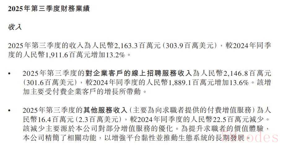 今年第三季度,BOSS直聘总营收额为21.63亿元,其中对企业客户的线上招聘服务收入为21.46亿元,同比增长了13.6%,占营收比重超过了99%;其他服务收入0.16亿元,去年同期则是0.23亿元,甚至还减少了,原因是为提升求职者体验,公司对部分增值服务进行优化,并精简了相关功能,目的是增强平台粘性,推动生态系统的长期发展。