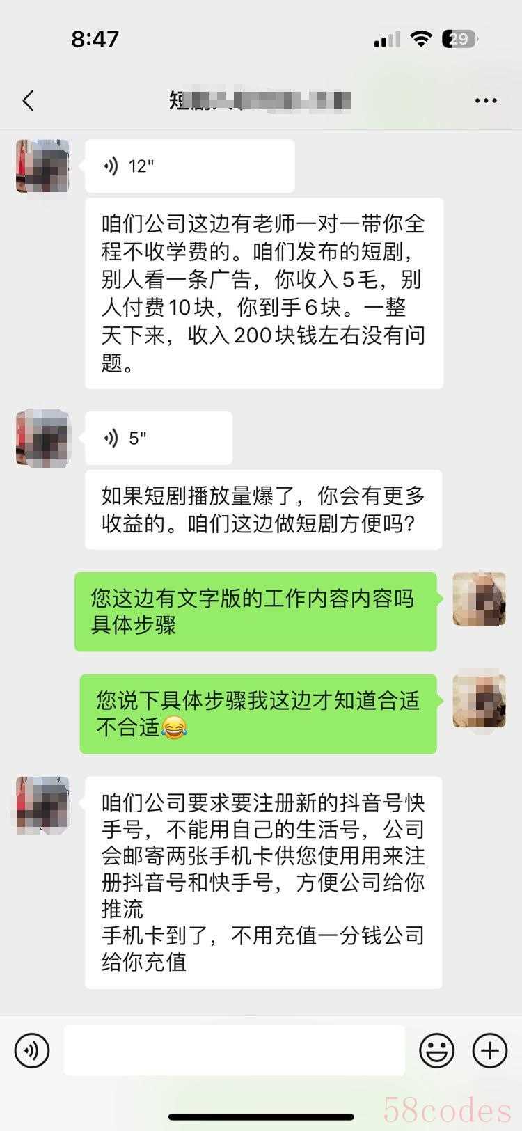 比如,一些不法分子以“短剧推广”的名义发布兼职信息,工作内容表面上是让求职者剪辑短视频,在抖音、快手等平台上发布,实际是诱骗求职者办电话卡。不法分子会寄给求职者两张流量卡,让求职者用身份证激活流量卡,注册短视频App发布内容。如果求职者质疑,对方会以“相当于免费得话费”“用你的身份证激活赚的钱才是你的”“新号方便公司推流”等理由继续诱导。