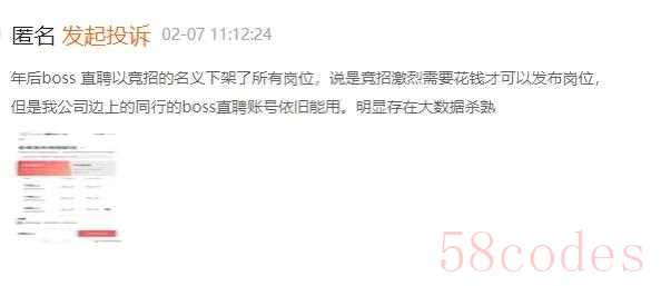 对于划定竞招岗位BOSS直聘客服的回复黑猫投诉上,对于划定为竞招岗位原因的解释,BOSS直聘给出的回复均是:由于职位在市场上火爆程度高,且竞争激烈,并长期处于供不应求的状态,会被列为竞招职位;具体以您编辑完职位系统根据地区、公司、行业、职类等维度的信息判定是否为竞招职位。对于相同发布信息收费不同的投诉,BOSS直聘的回复则是:平台付费标准是根据不同城市、不同行业、不同岗位、不同供需关系、有无优惠券等多维度综合判断。不过,这样的答复并未获得网友的认可。有网友直接回怼:官方的话术我已经听了很多次了,五线城市前端后端职位都能是竞招,就麻烦你给我举个例子五线城市什么职位不是竞招,如果说不出来,是不是就意味着你们默认所有职位要花钱,让用户强制消费。