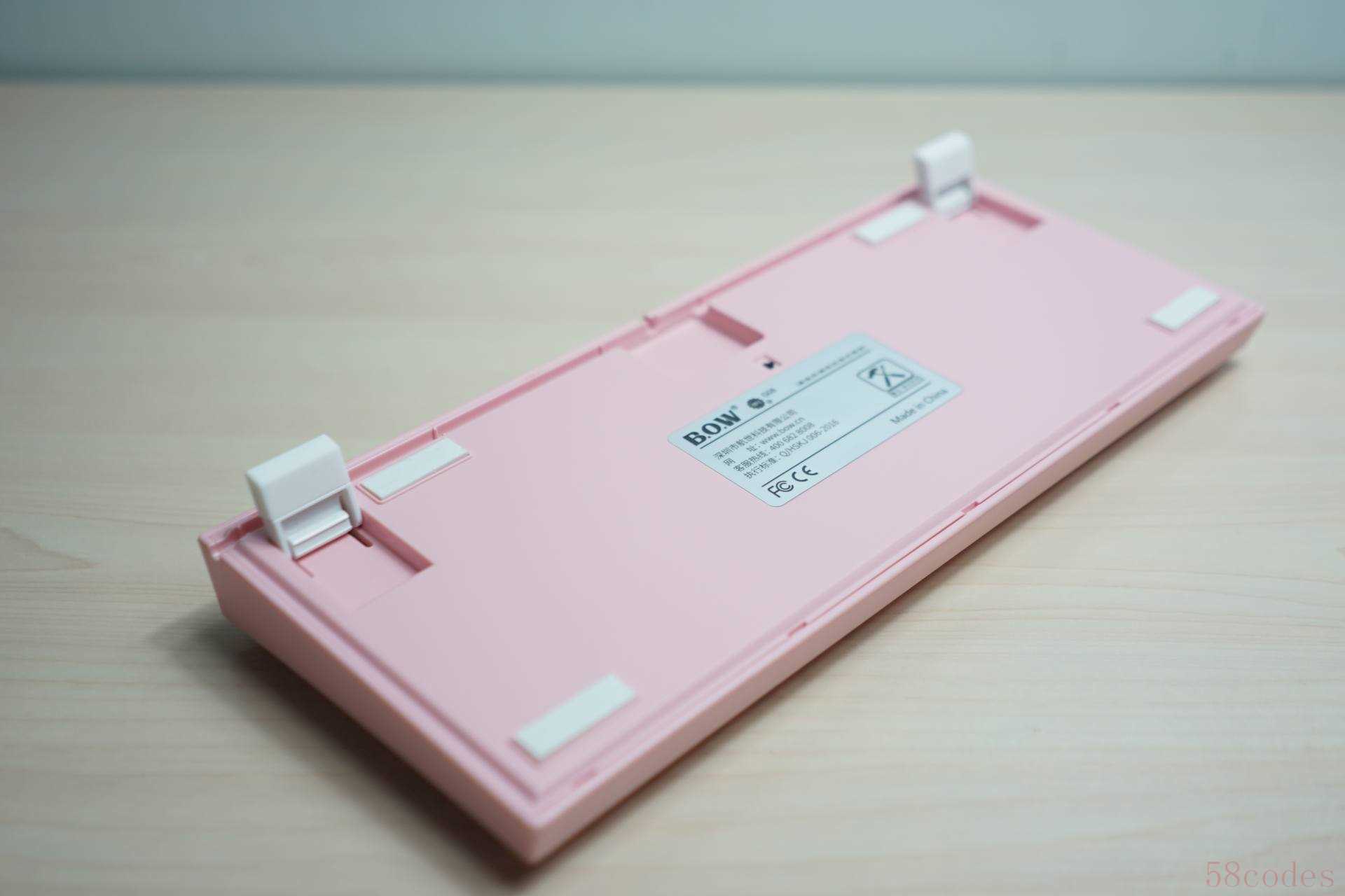 BOW 航世G08机械键盘采用人体工学设计,键盘的背面有两个支架,键盘与桌面可实现倾斜工学夹角,符合人手敲击弧线使用的时候更加舒适。键盘的背部位置有一个Type- C的接口,用来给键盘充电和有线连接使用的。