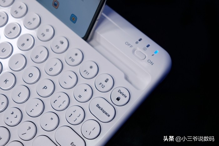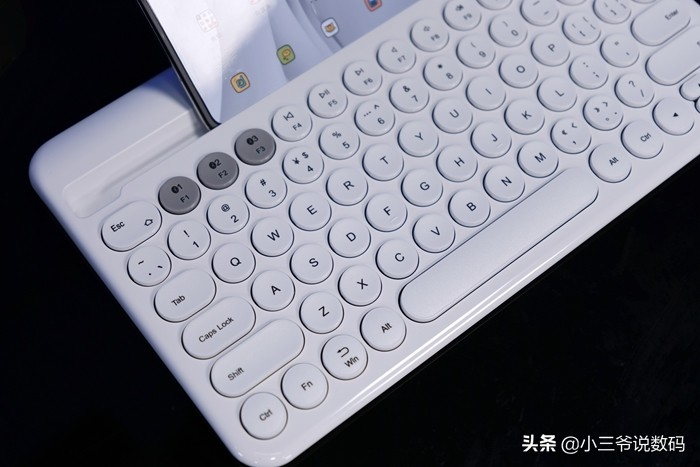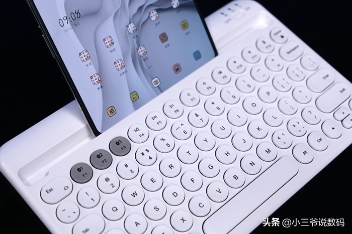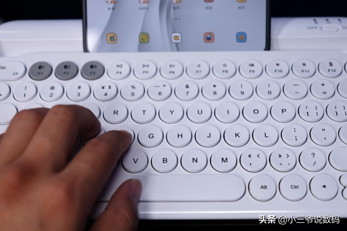 键盘通过蓝牙5.0与手机、平板、笔记本进行配对,连接速度快、打字无延迟,最多可以同时连接3台设备,并且可以通过F1-F3快捷键实现一键切换。