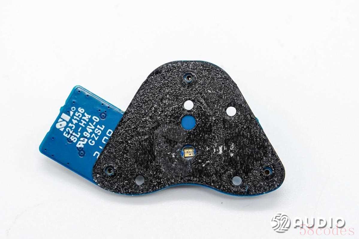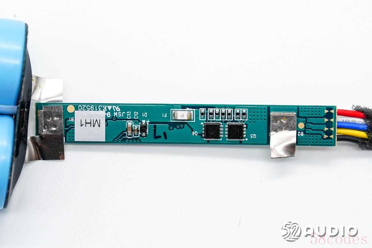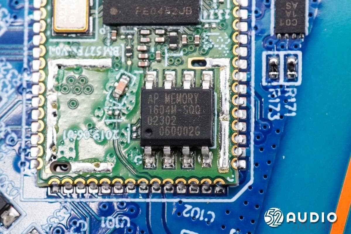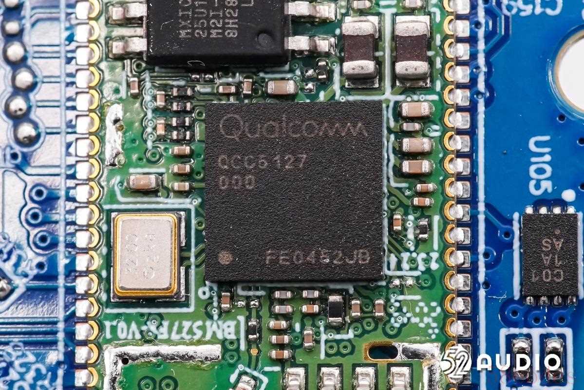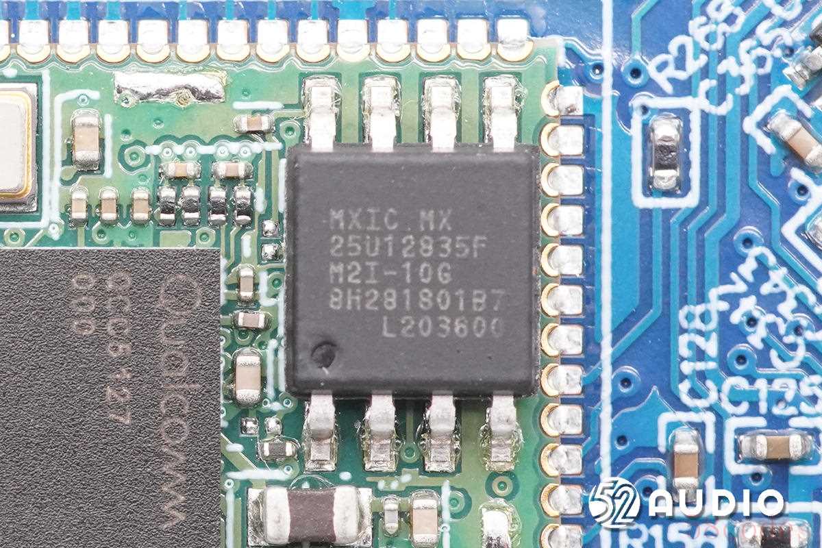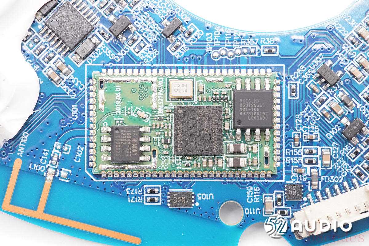 后腔设置有锂电池和主板单元,2串锂离子电池组容量3100mAh,来自广东力科新能源。主板上蓝牙模块设置在独立的邮票板上,采用了高通QCC5127蓝牙音频SoC,内置强大的四核处理器,双核32位音频应用子系统,双核高通Kalimba DSP音频系统;外围配备旺宏25U12835F 128Mb位串行NOR闪存,爱普APS1604M-SQ储存器。