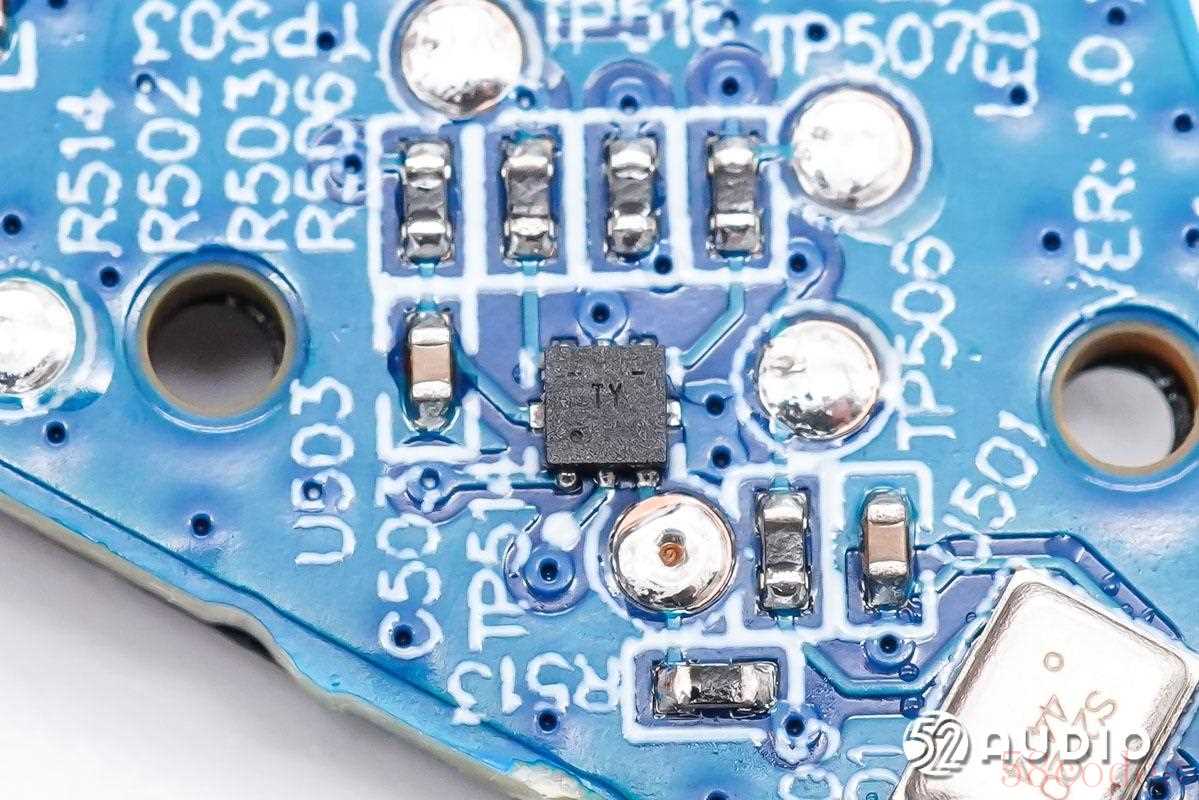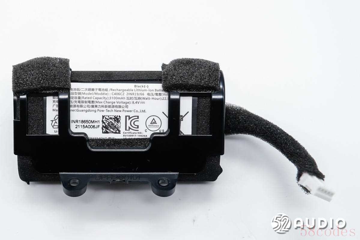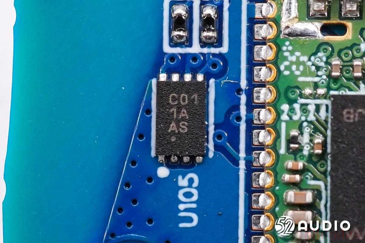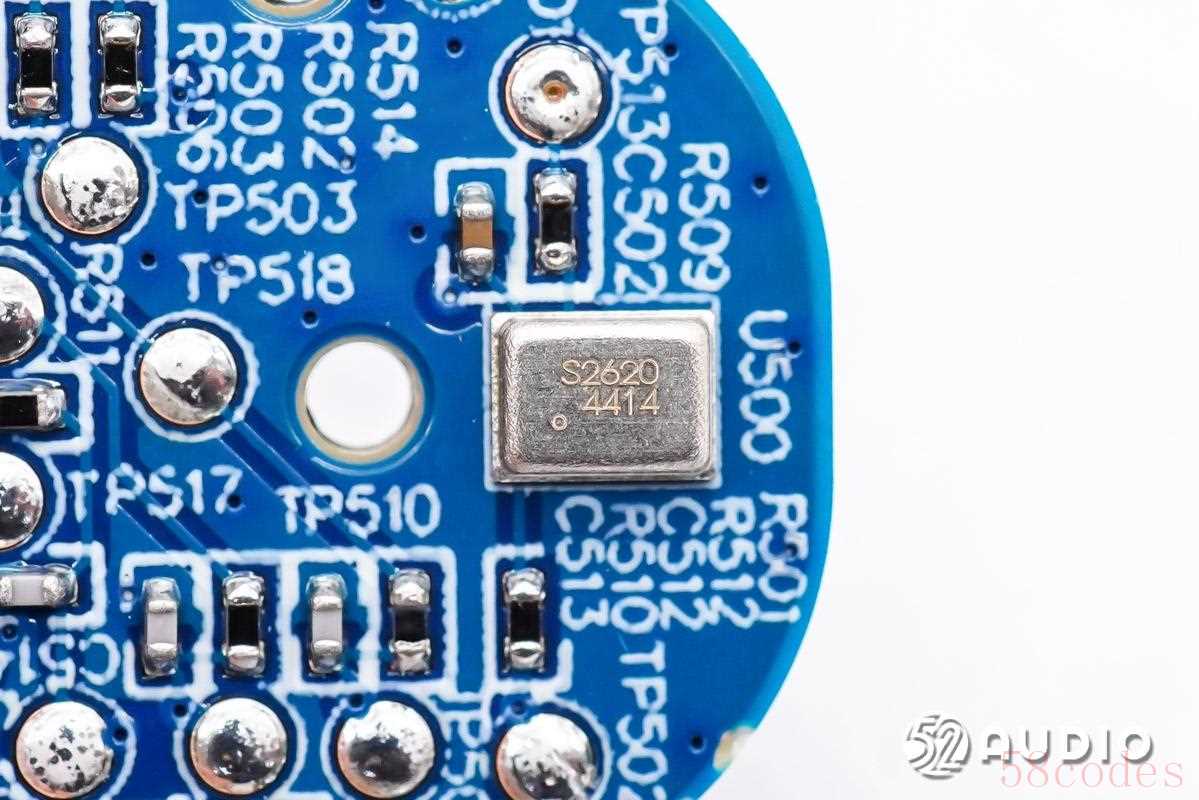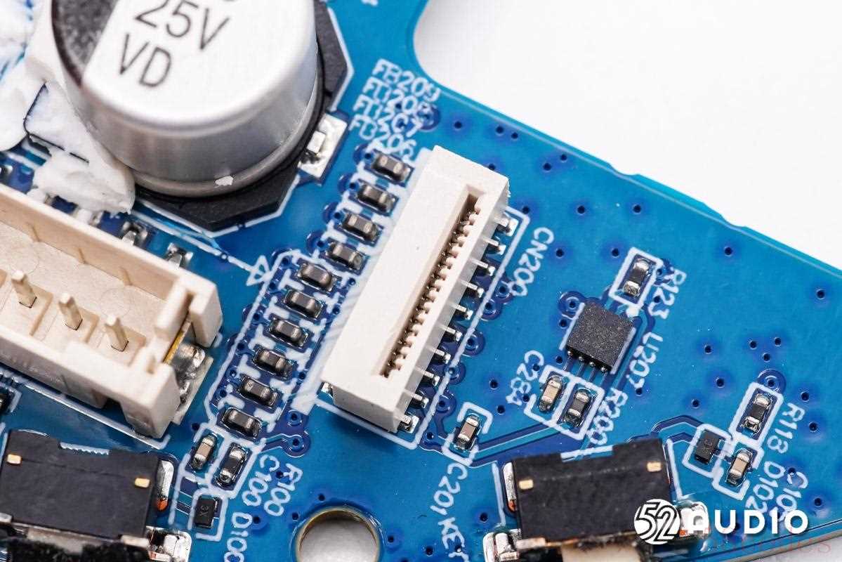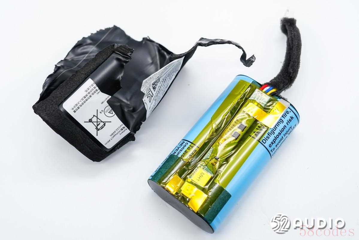后腔设置有锂电池和主板单元,2串锂离子电池组容量3100mAh,来自广东力科新能源。主板上蓝牙模块设置在独立的邮票板上,采用了高通QCC5127蓝牙音频SoC,内置强大的四核处理器,双核32位音频应用子系统,双核高通Kalimba DSP音频系统;外围配备旺宏25U12835F 128Mb位串行NOR闪存,爱普APS1604M-SQ储存器。