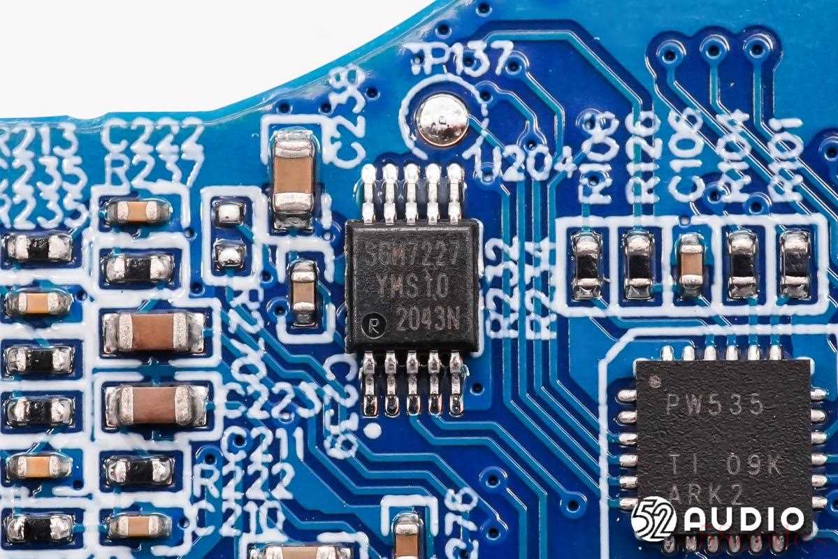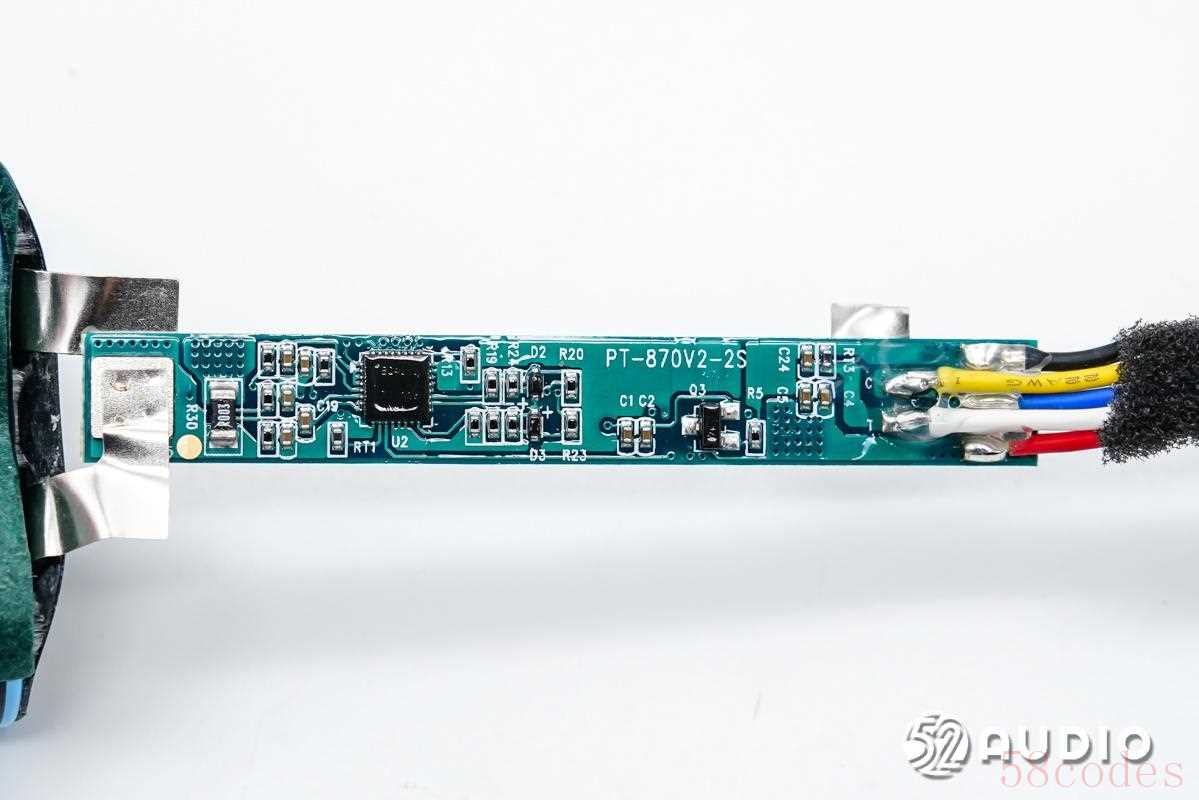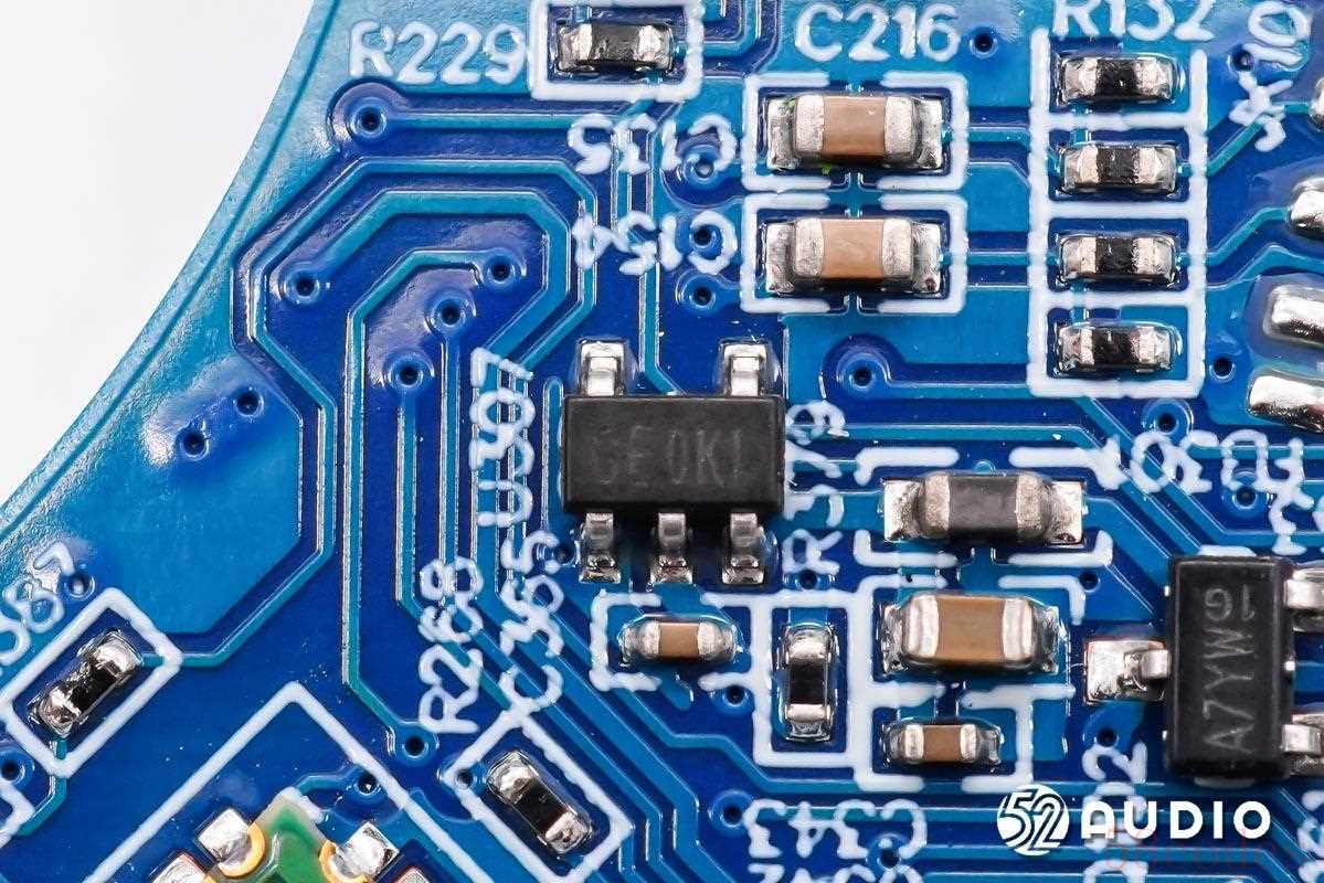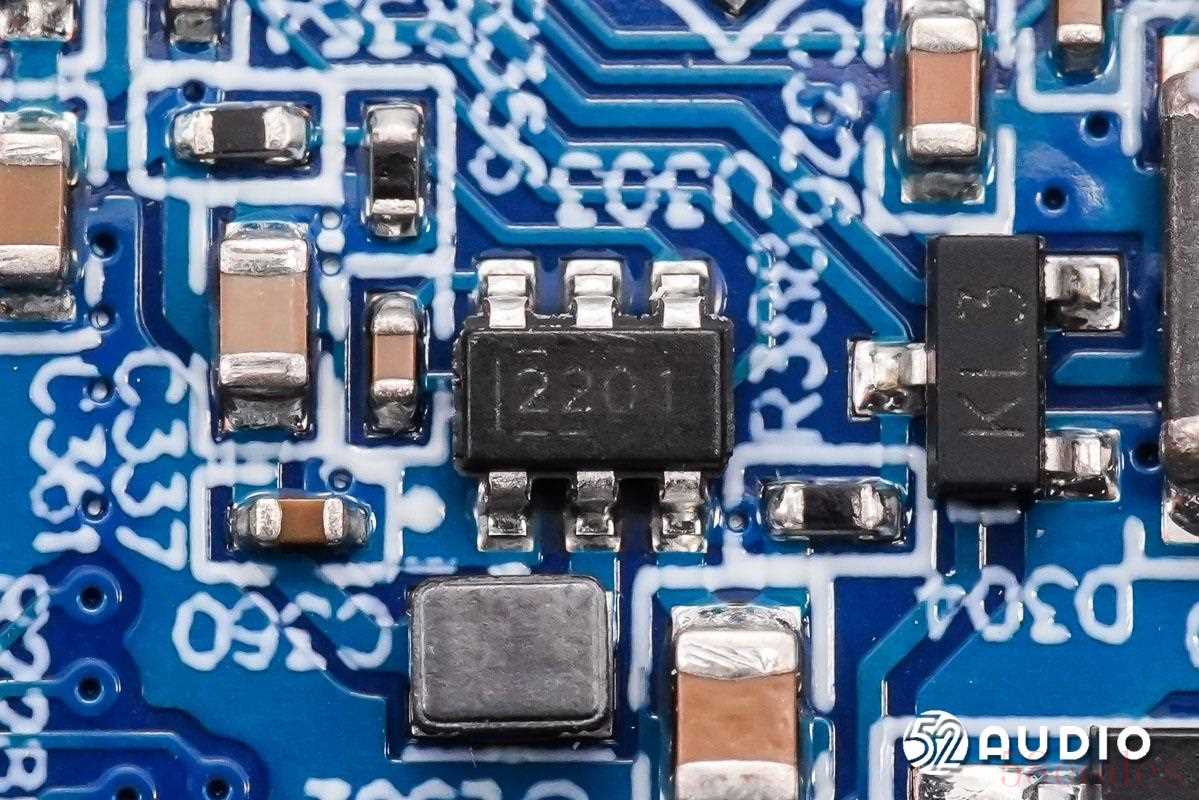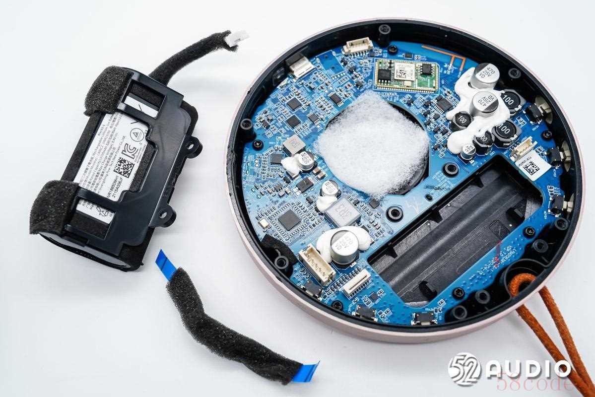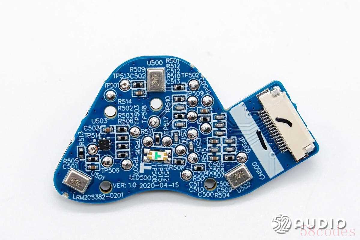 后腔设置有锂电池和主板单元,2串锂离子电池组容量3100mAh,来自广东力科新能源。主板上蓝牙模块设置在独立的邮票板上,采用了高通QCC5127蓝牙音频SoC,内置强大的四核处理器,双核32位音频应用子系统,双核高通Kalimba DSP音频系统;外围配备旺宏25U12835F 128Mb位串行NOR闪存,爱普APS1604M-SQ储存器。