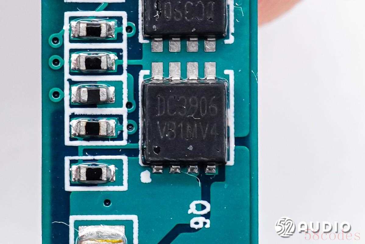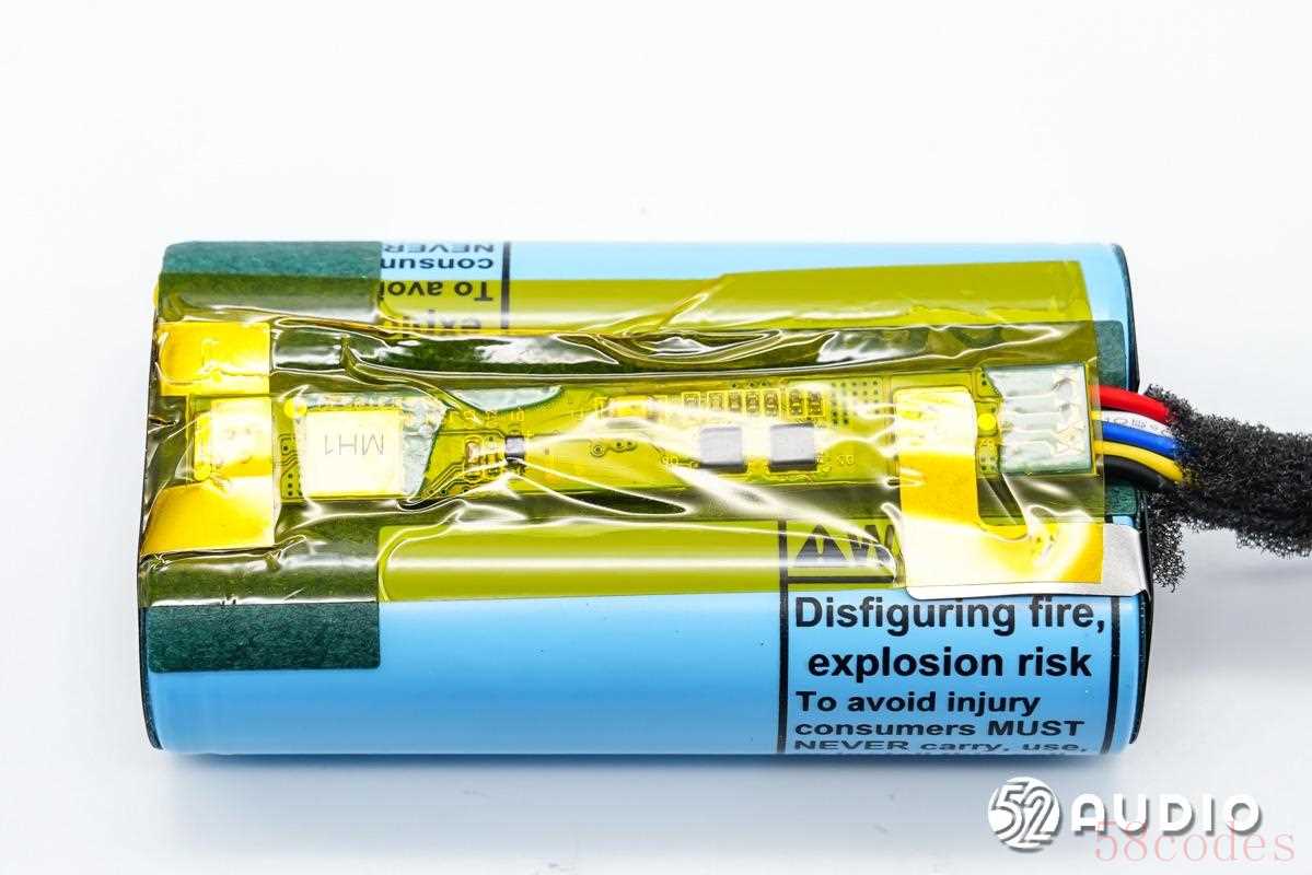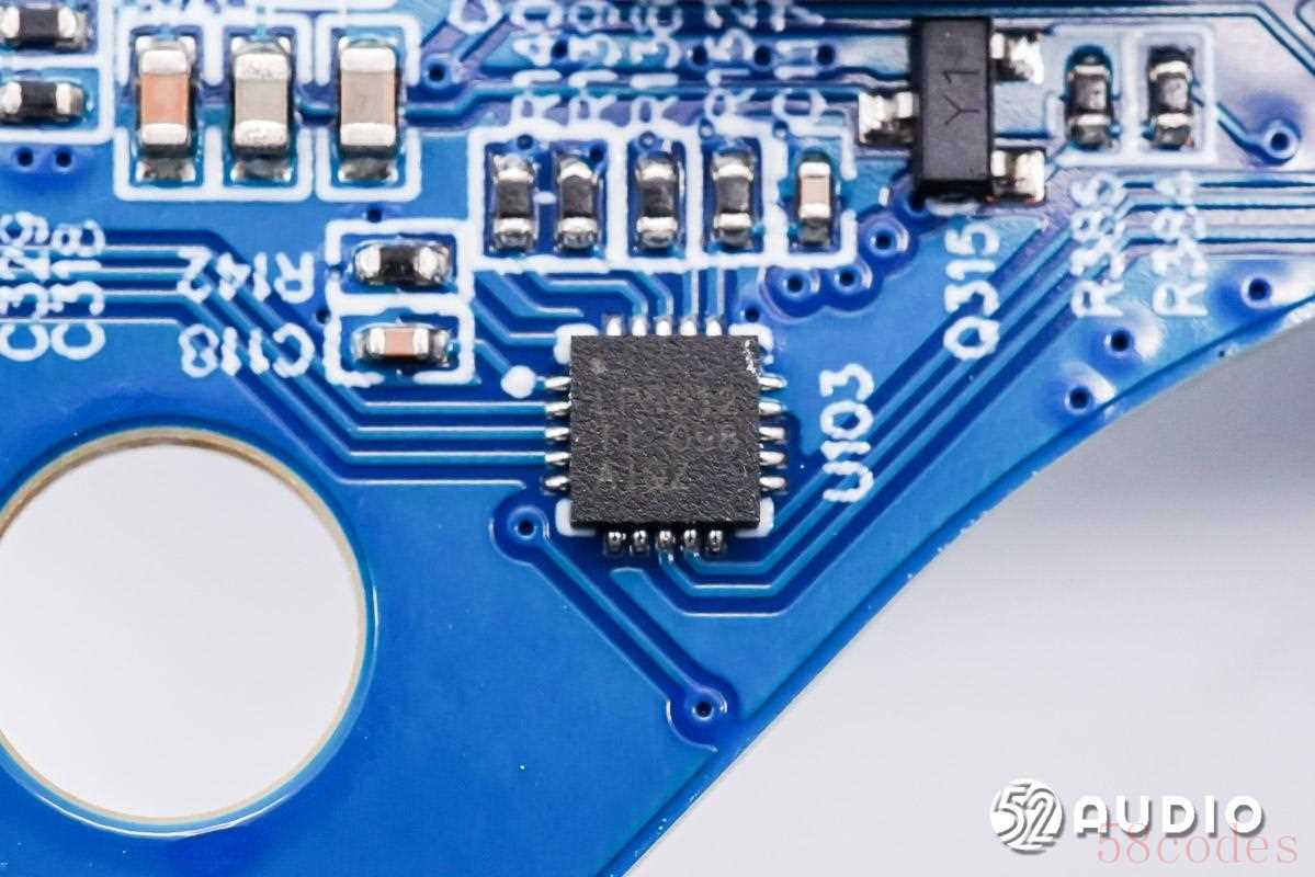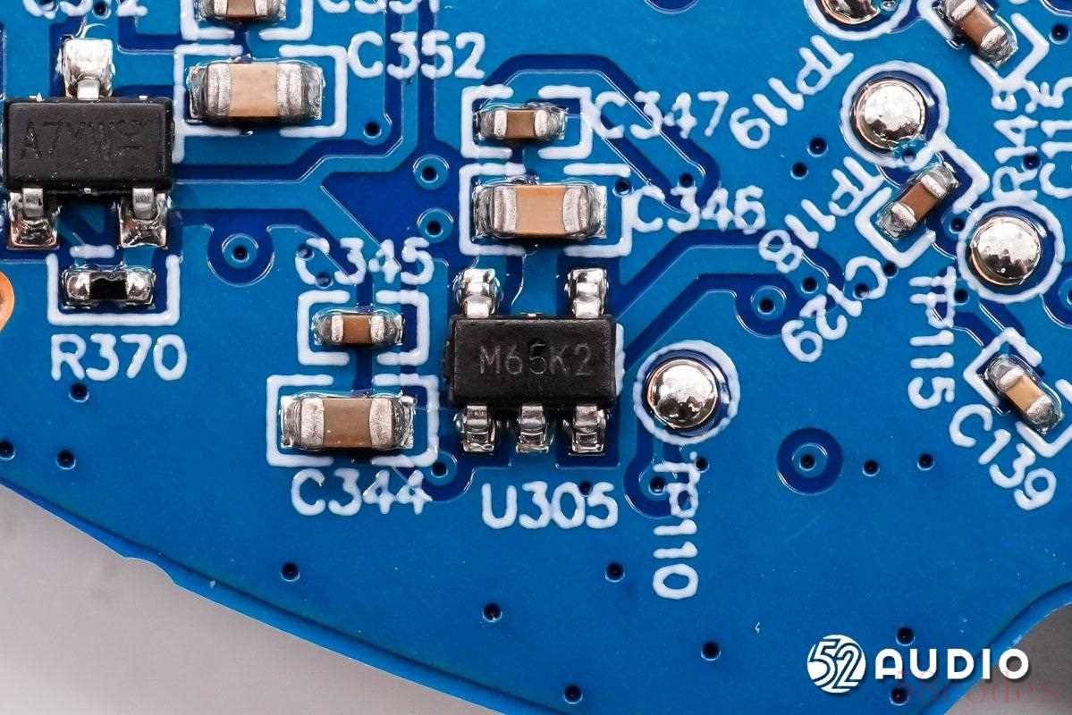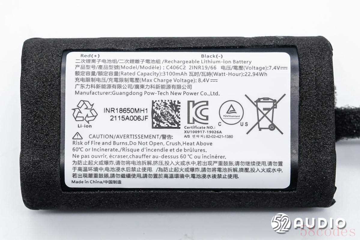 后腔设置有锂电池和主板单元,2串锂离子电池组容量3100mAh,来自广东力科新能源。主板上蓝牙模块设置在独立的邮票板上,采用了高通QCC5127蓝牙音频SoC,内置强大的四核处理器,双核32位音频应用子系统,双核高通Kalimba DSP音频系统;外围配备旺宏25U12835F 128Mb位串行NOR闪存,爱普APS1604M-SQ储存器。