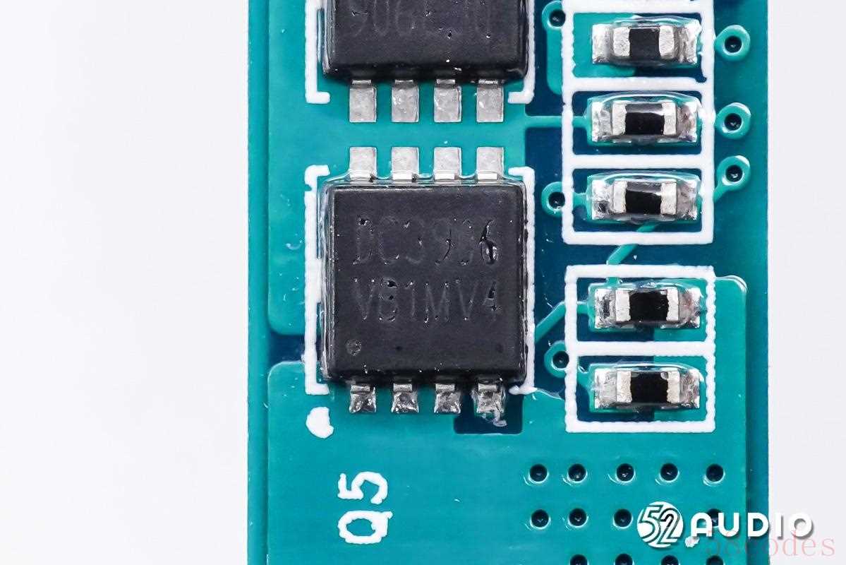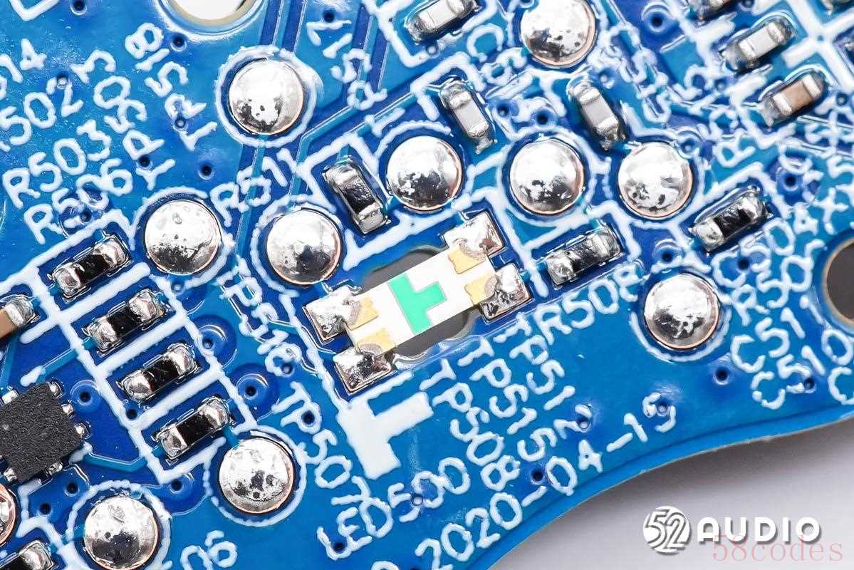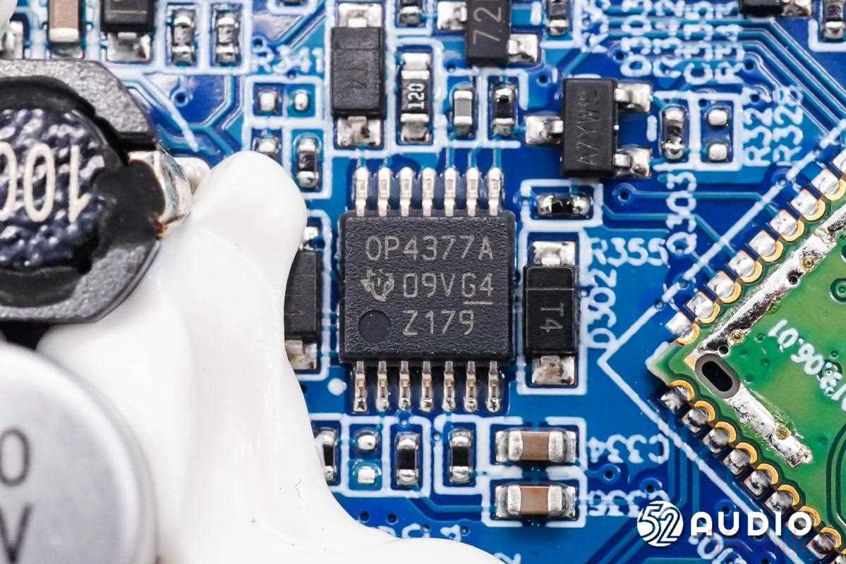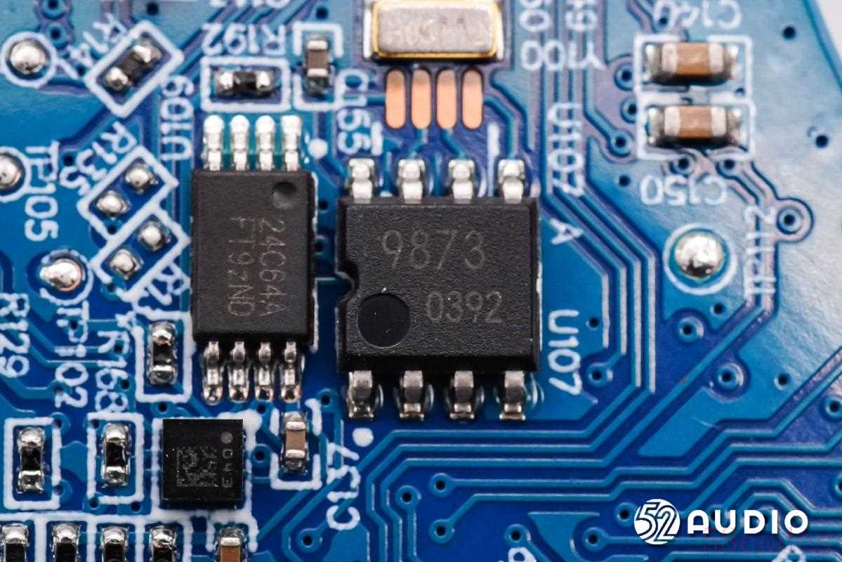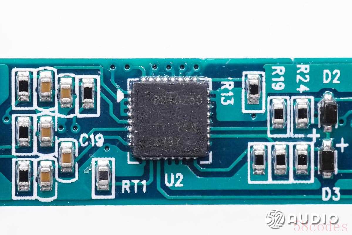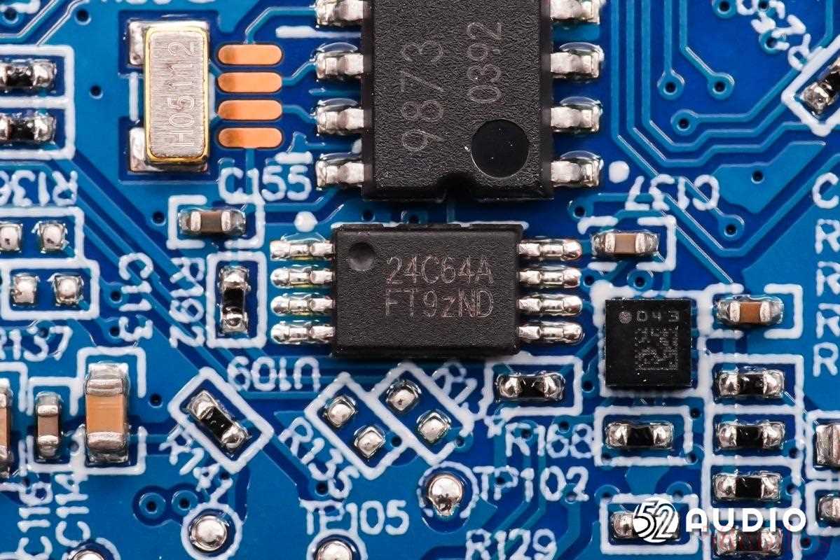 后腔设置有锂电池和主板单元,2串锂离子电池组容量3100mAh,来自广东力科新能源。主板上蓝牙模块设置在独立的邮票板上,采用了高通QCC5127蓝牙音频SoC,内置强大的四核处理器,双核32位音频应用子系统,双核高通Kalimba DSP音频系统;外围配备旺宏25U12835F 128Mb位串行NOR闪存,爱普APS1604M-SQ储存器。
