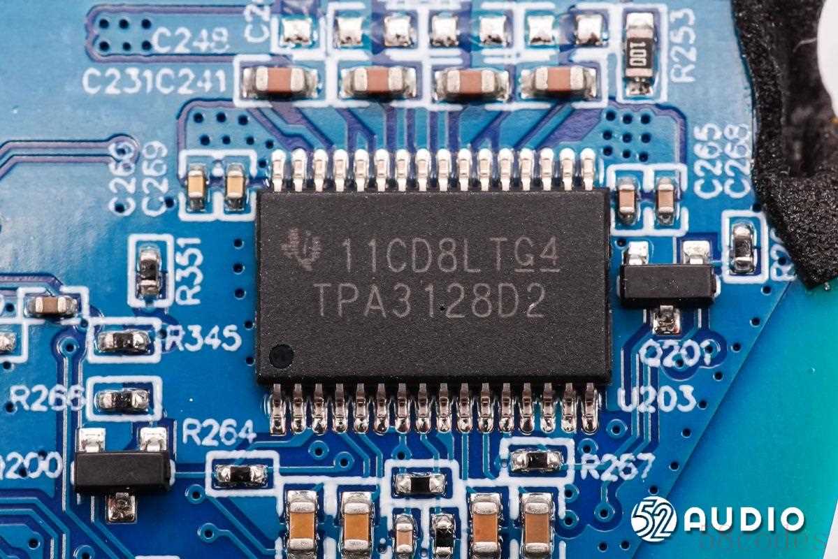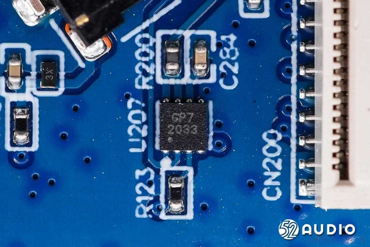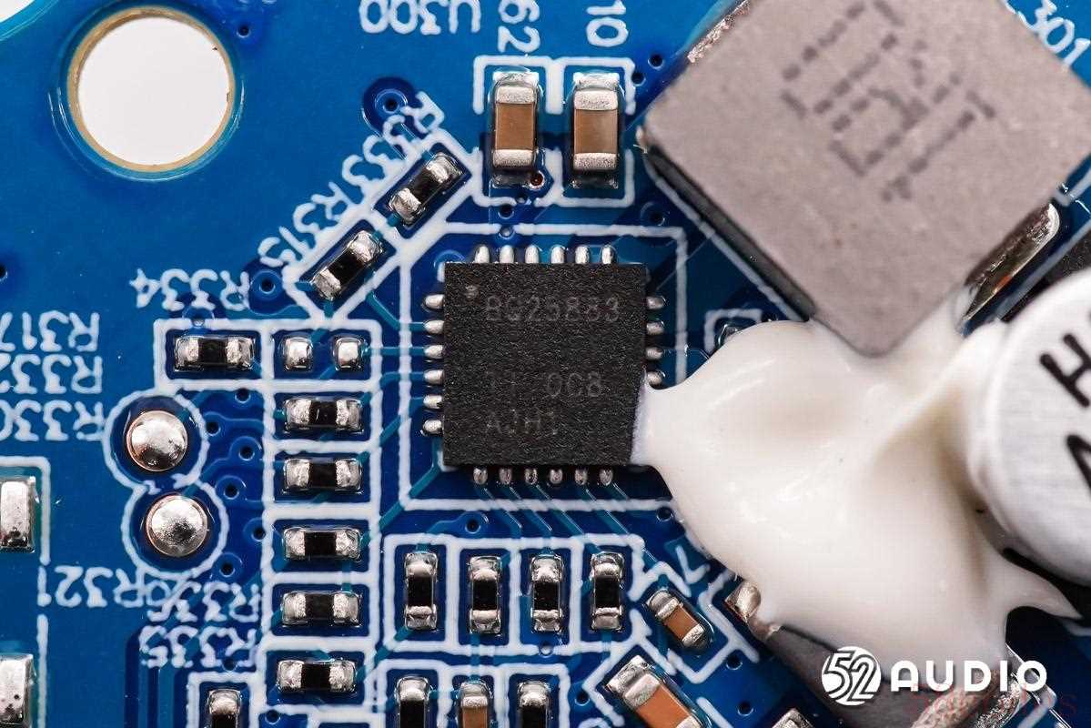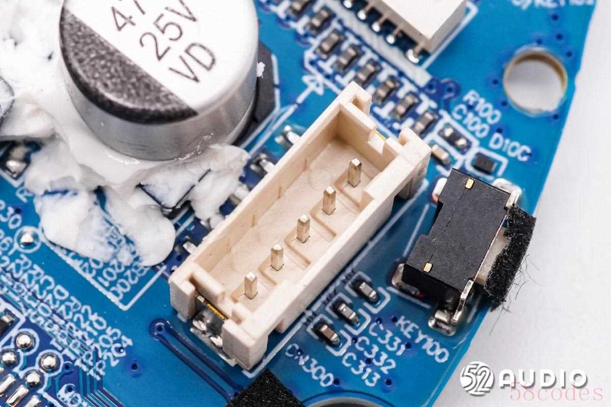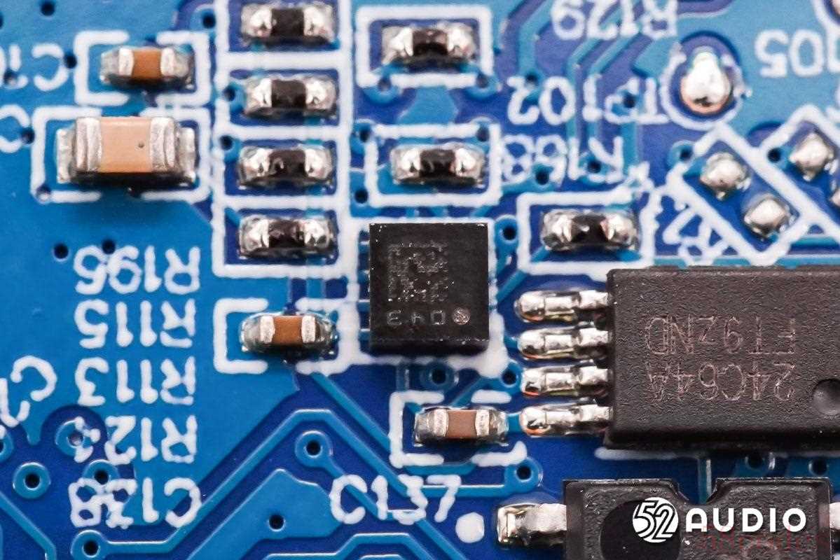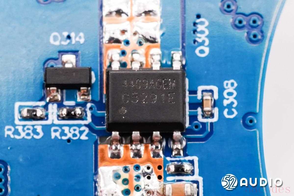 后腔设置有锂电池和主板单元,2串锂离子电池组容量3100mAh,来自广东力科新能源。主板上蓝牙模块设置在独立的邮票板上,采用了高通QCC5127蓝牙音频SoC,内置强大的四核处理器,双核32位音频应用子系统,双核高通Kalimba DSP音频系统;外围配备旺宏25U12835F 128Mb位串行NOR闪存,爱普APS1604M-SQ储存器。