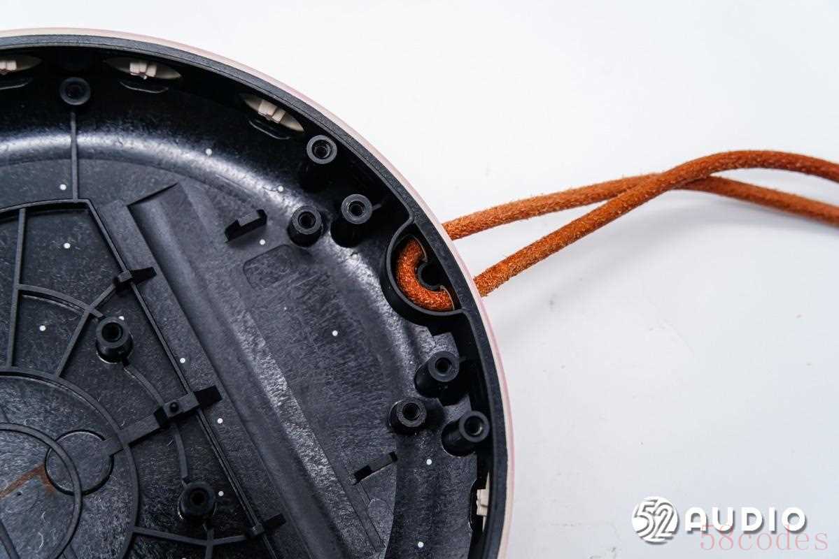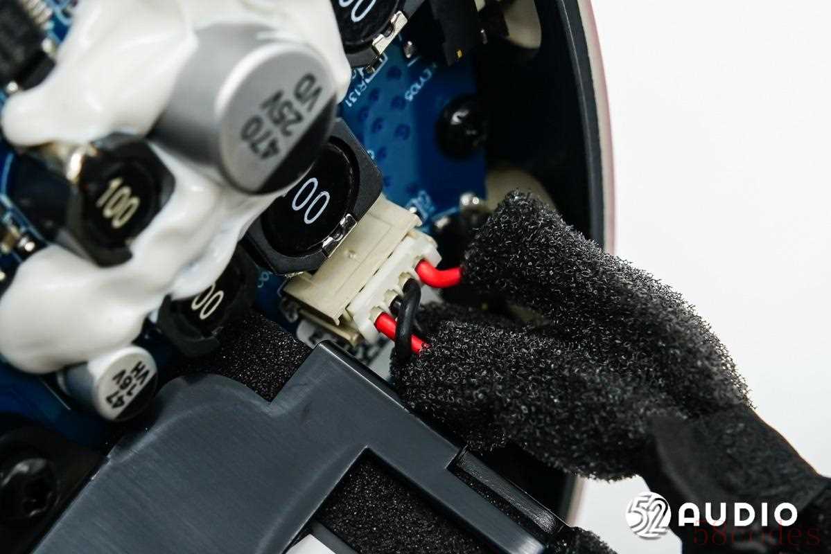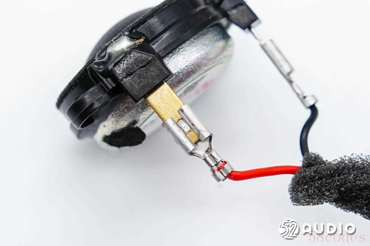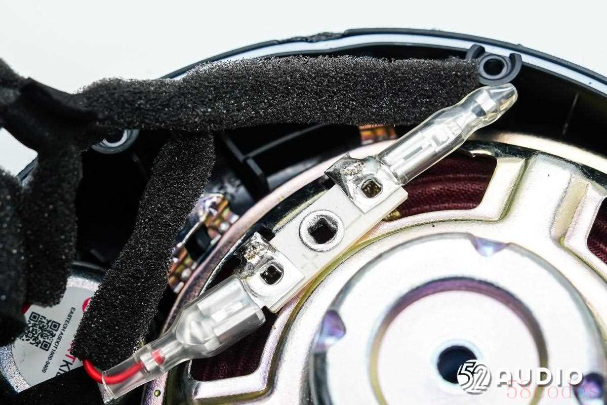 扬声器导线焊接点特写,通过胶套绝缘。导线设置有泡棉,防止共振产生杂音。