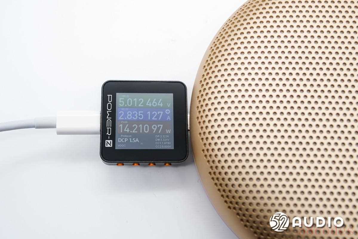 我爱音频网采用CHARGERLAB POWER-Z KM002C对B&O A1 GEN2蓝牙音箱进行有线充电测试,输入功率约为14.21W。