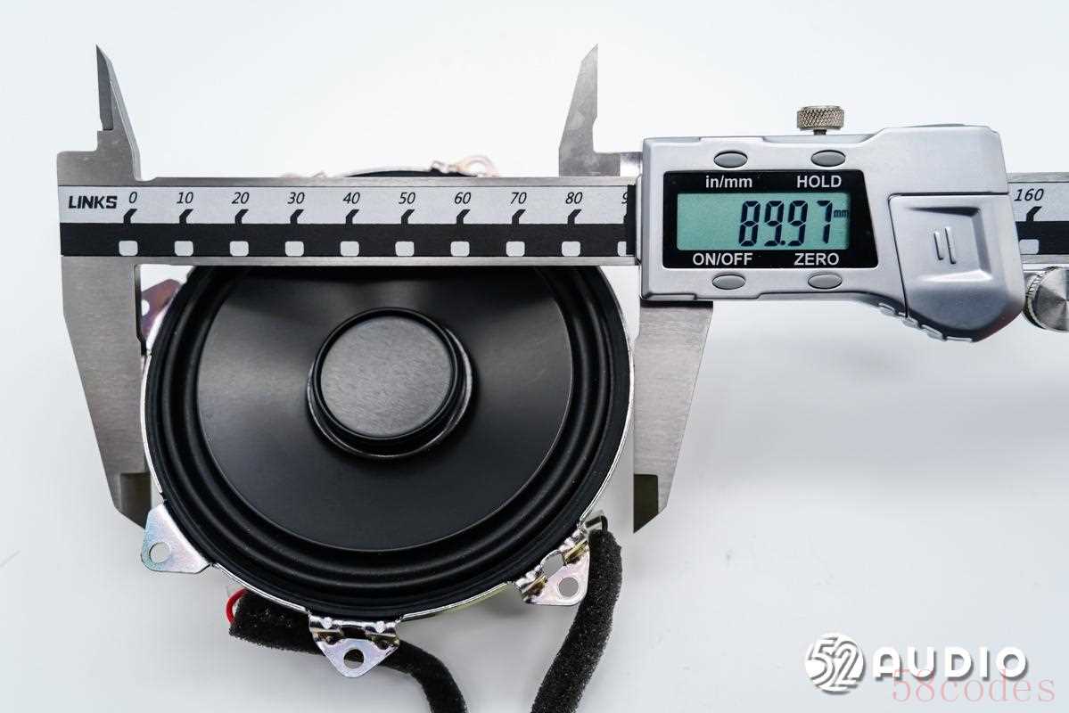 经我爱音频网实测,扬声器尺寸约为90mm。