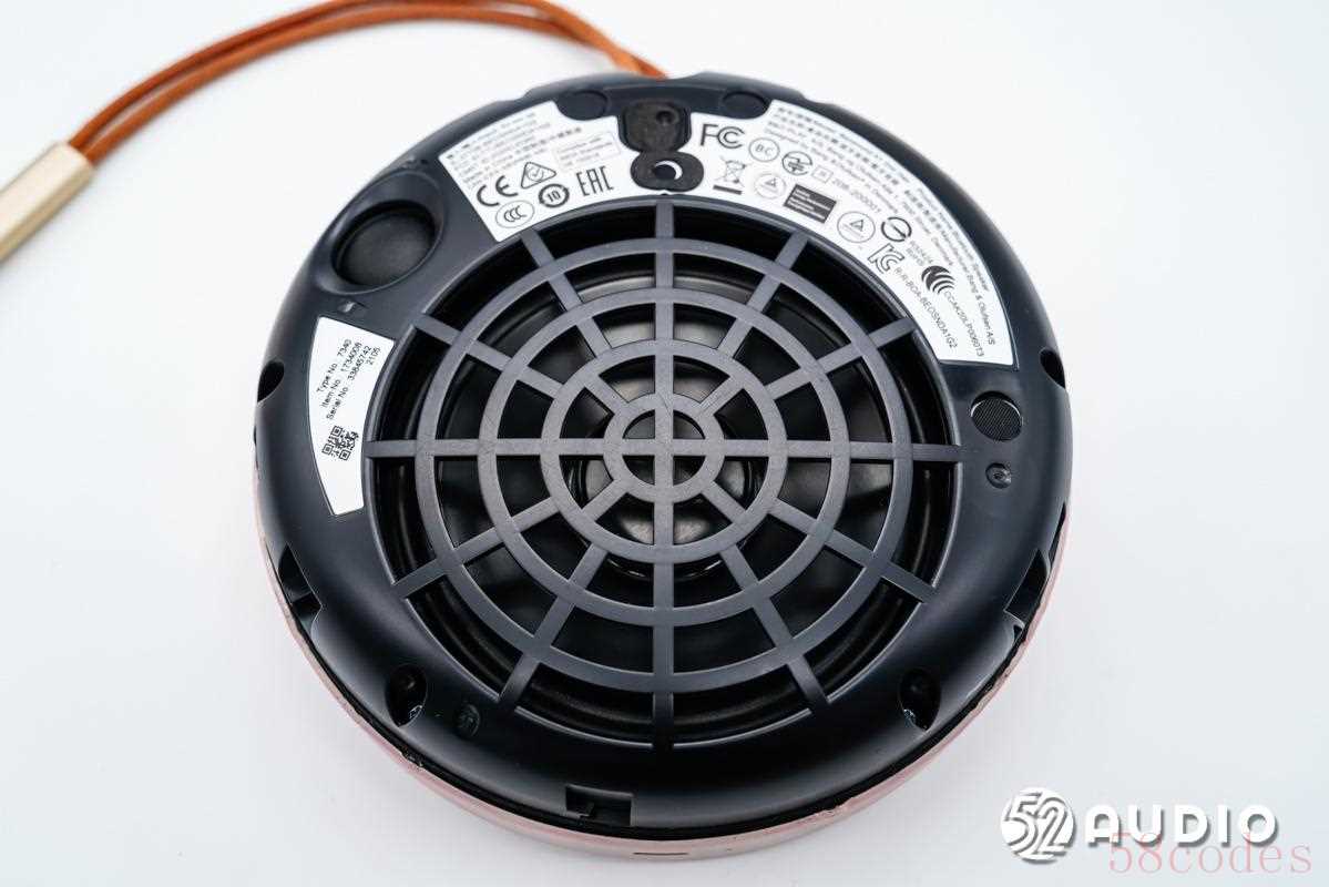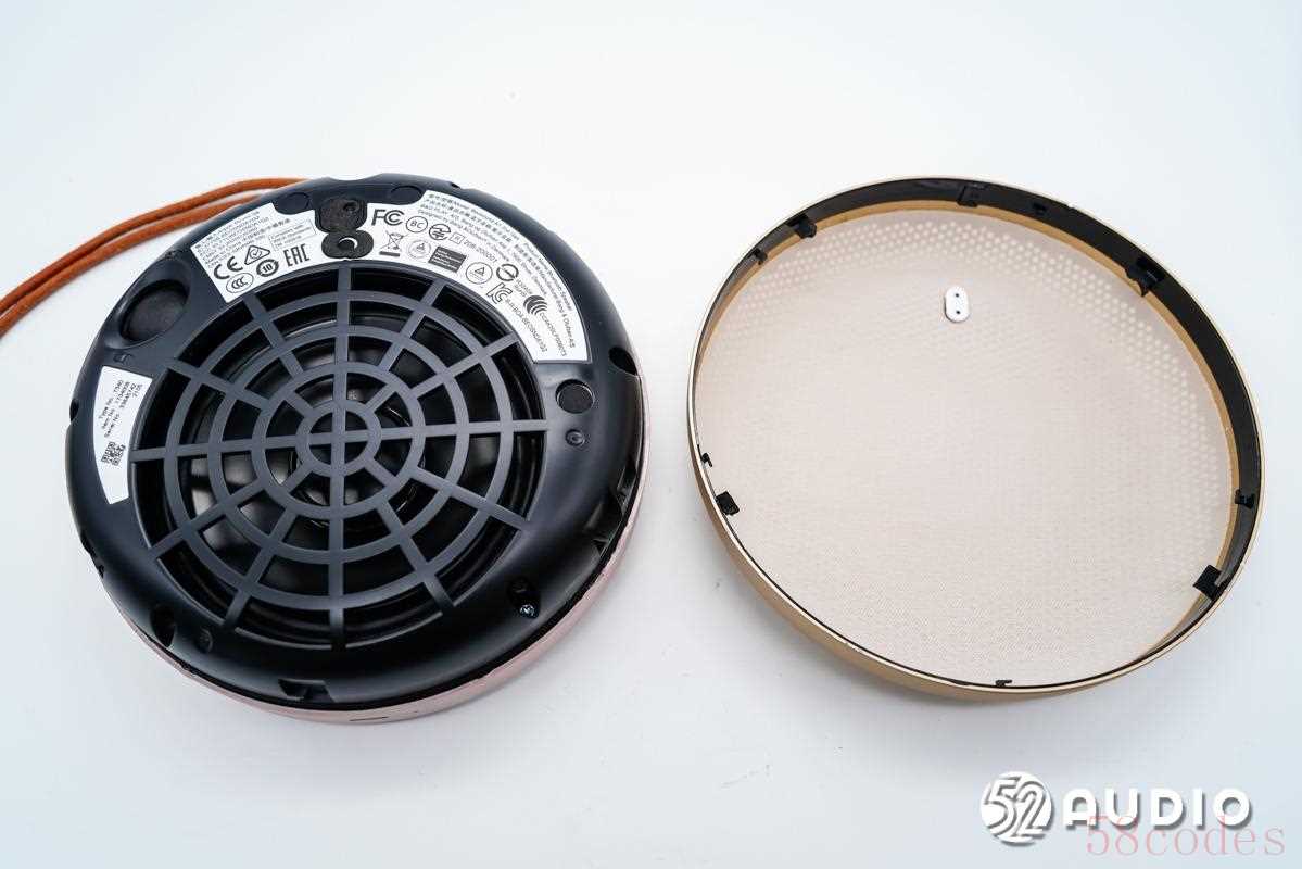 打开包装盒,取出音箱,音箱延续了上代的经典“圆饼状”设计,采用了金色盖板。