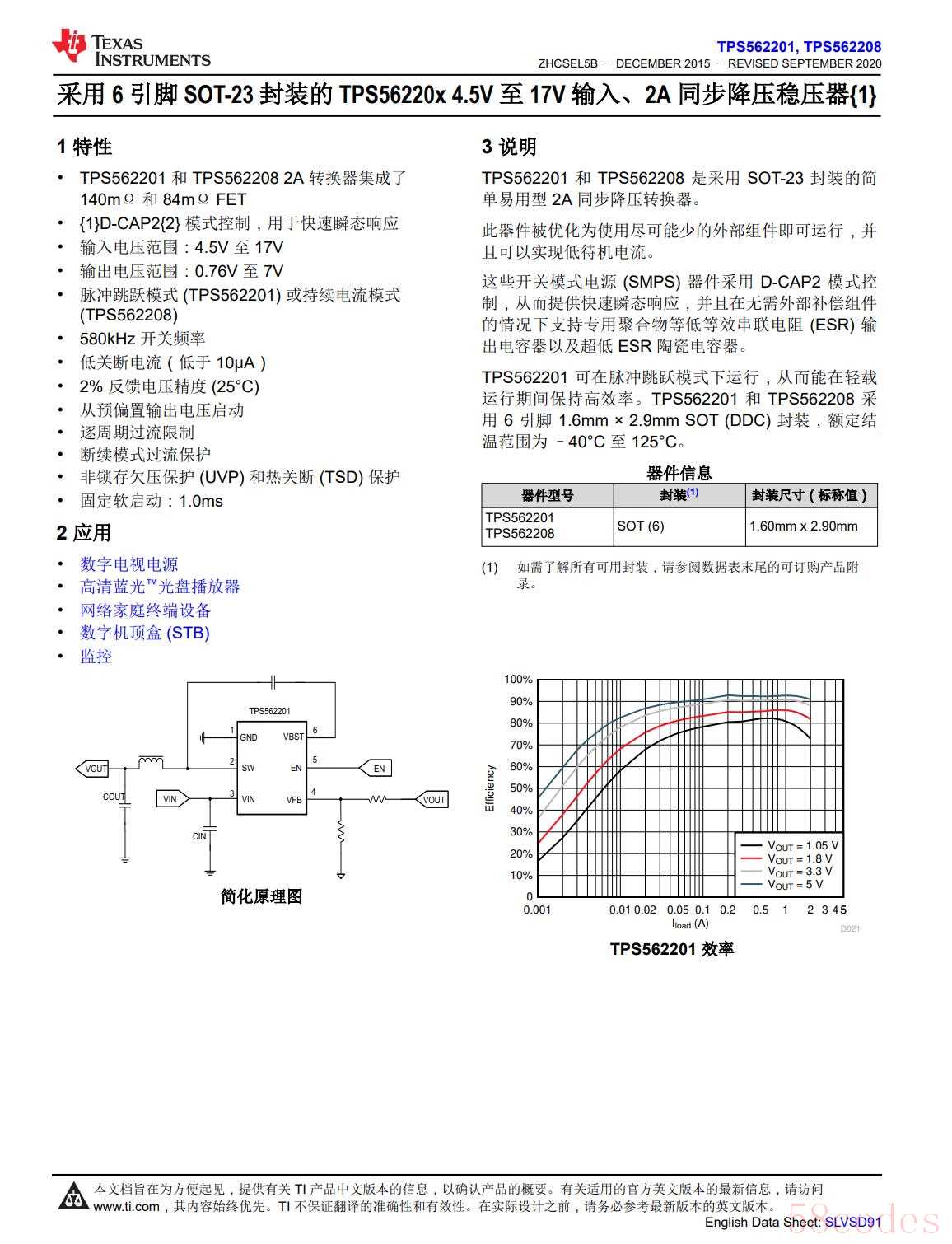 TI TPS562201 同步降压转换器,支持17V输入电压,2A输出电流,内置开关管,采用SOT23-6封装。