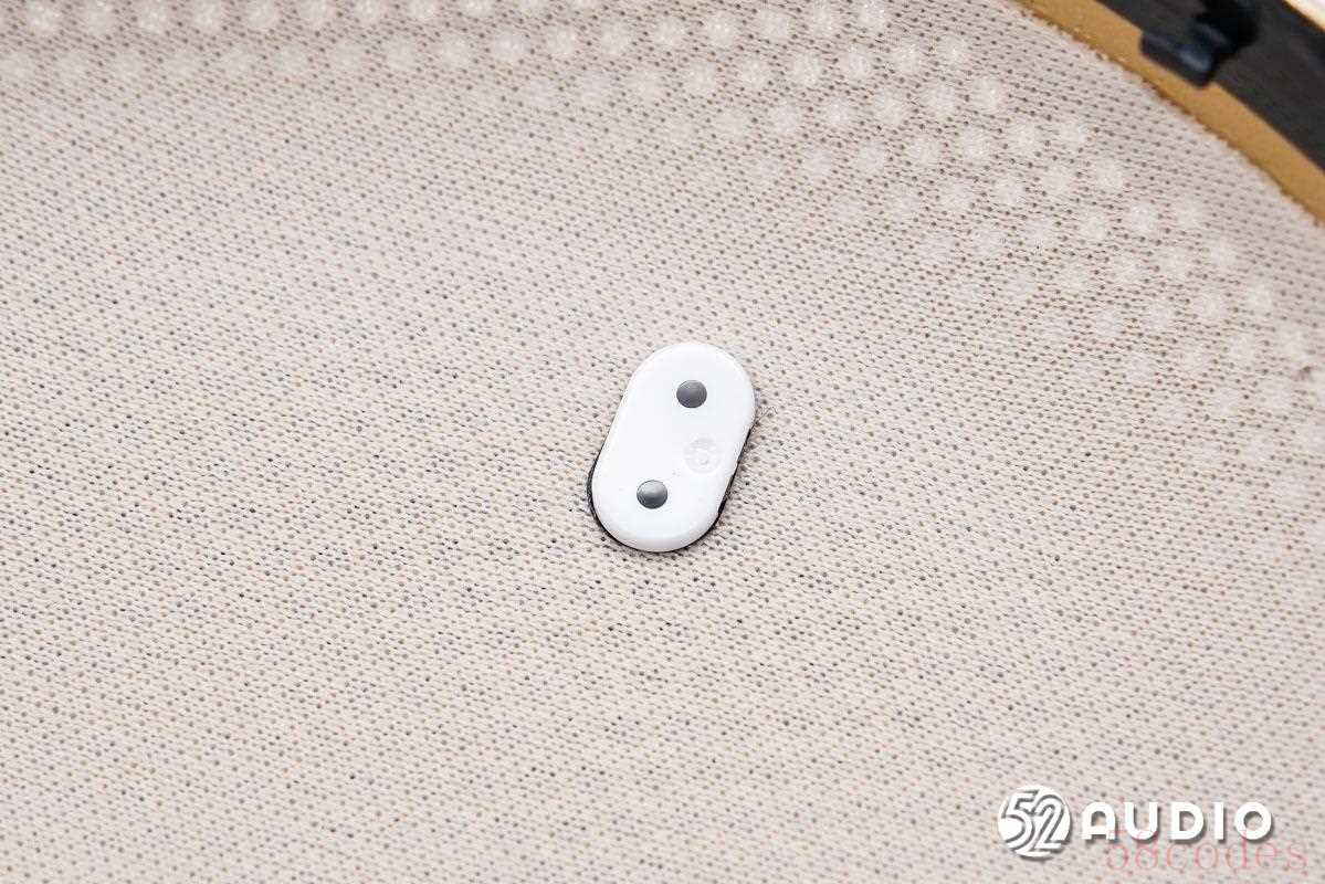 出音孔上隐藏的指示灯特写,盖板内侧设置有细密防尘网,防止异物进入音腔。