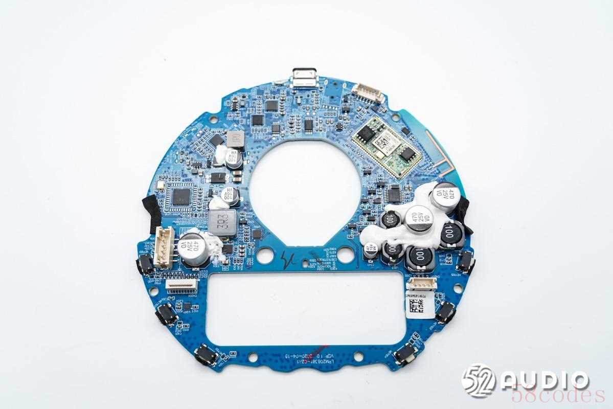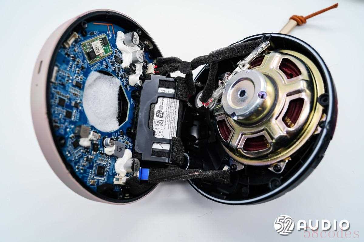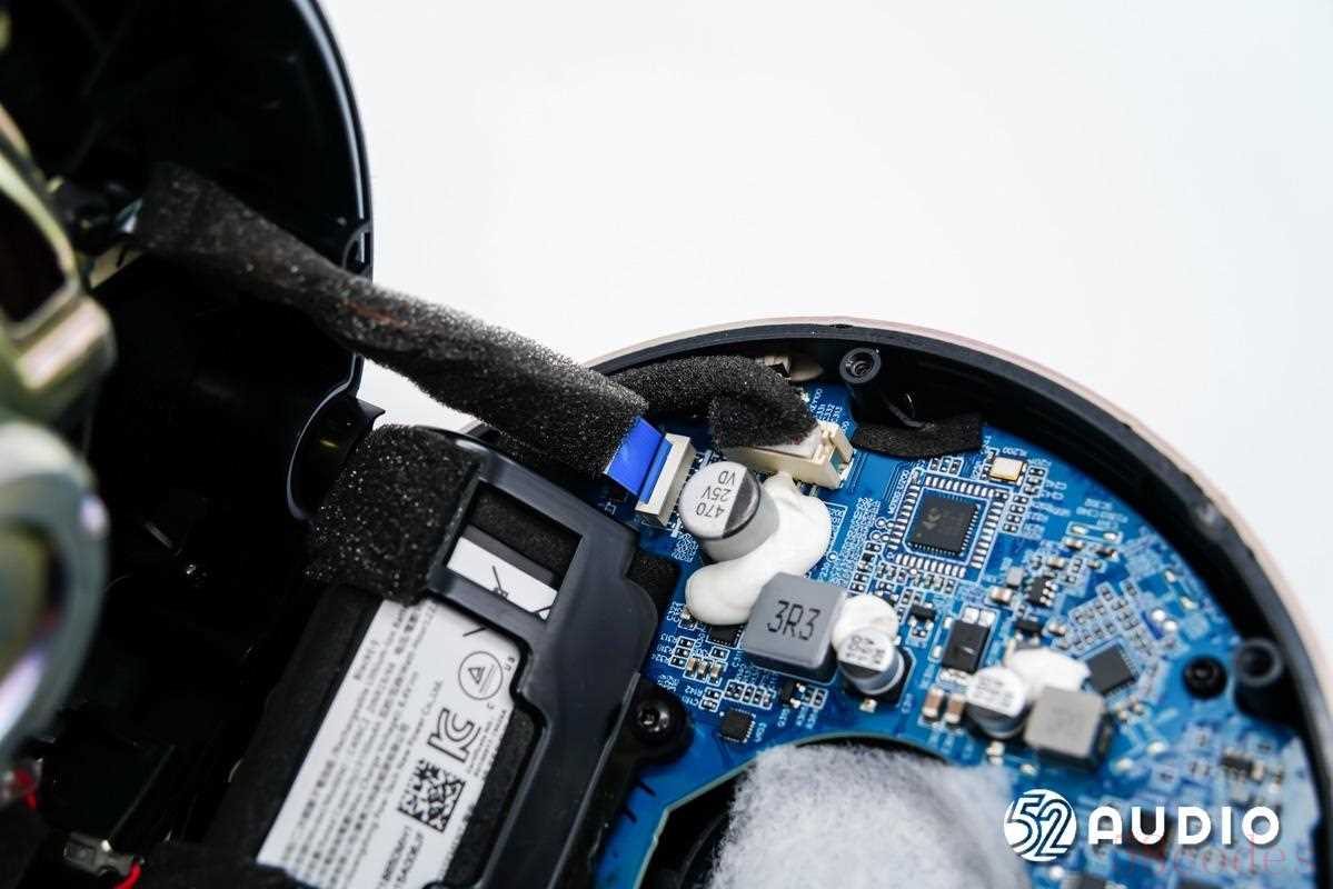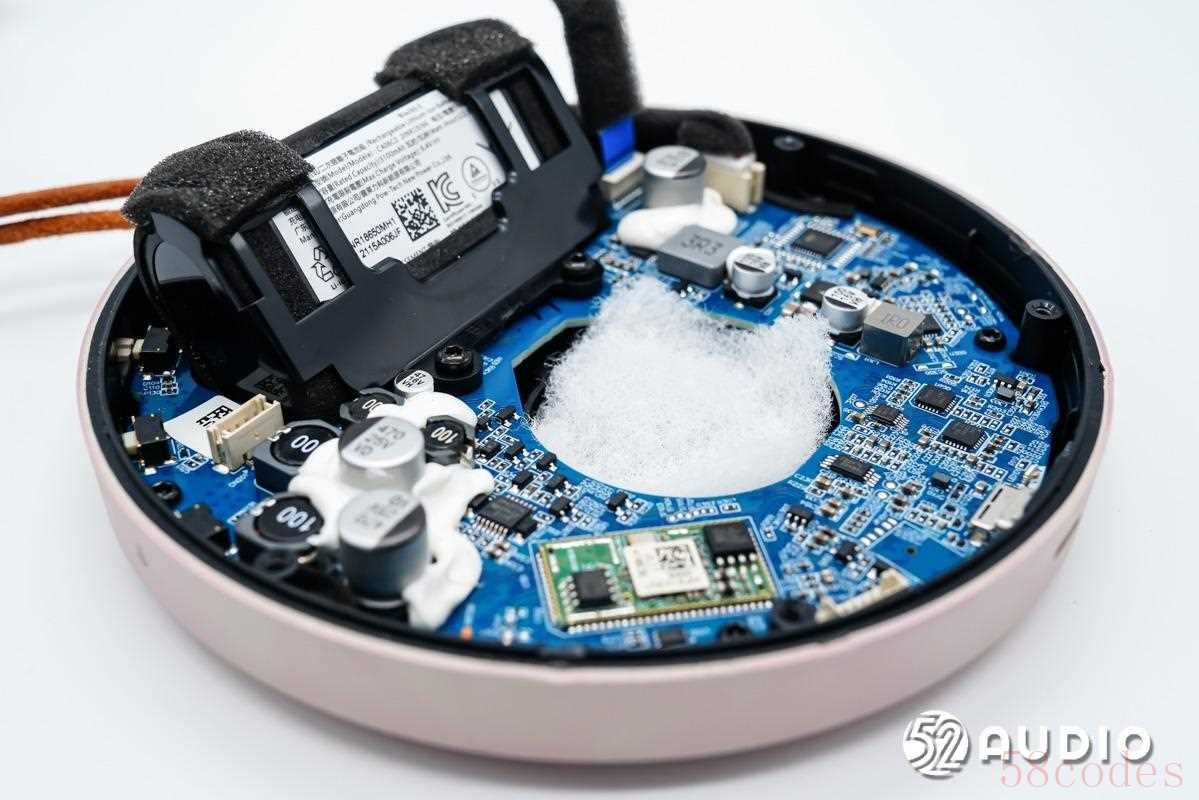 内部结构配置方面,前腔内搭载了90mm低音单元和25mm高音喇叭;设置有麦克风小板,设置三颗MEMS麦克风组成是拾音阵列,搭配后腔主板上的楼氏电子IA8201音频边缘处理器,提供清晰、干净、精准的收音效果。