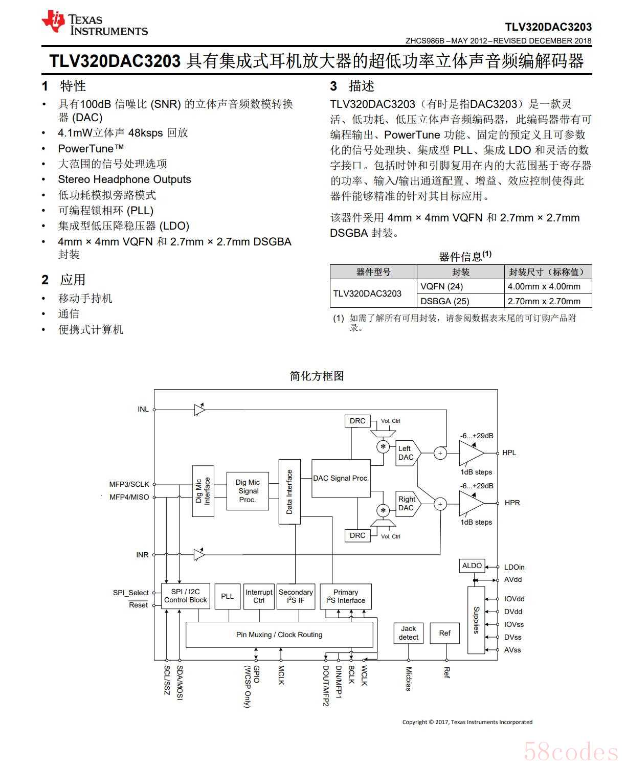 TI德州仪器TLV320DAC3203音频编解码器,采用4mm×4mm VQFN封装,是一款灵活、低功耗、低压立体声音频编码器,此编码器带有可编程输出、PowerTune功能、固定的预定义且可参数化的信号处理块、集成型PLL、集成LDO和灵活的数字接口。