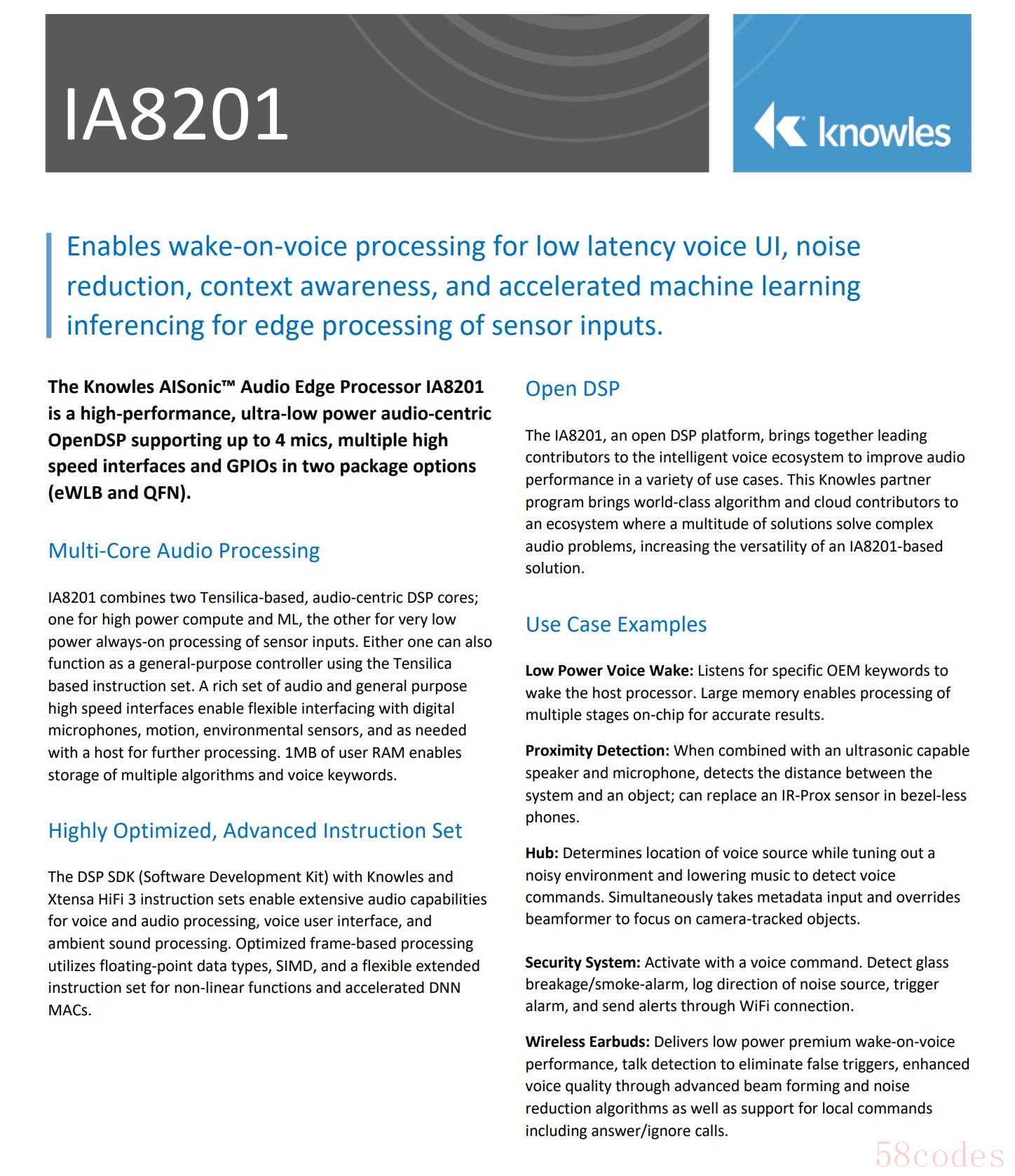 knowles楼氏电子IA8201音频边缘处理器,是一款高性能、超低功耗音频中央处理器,支持低延迟语音Ul的语音唤醒处理、噪音减少、上下文感知和加速机器学习推断传感器输入,支持多达4个麦克风、多个高速接口和两种封装选项。