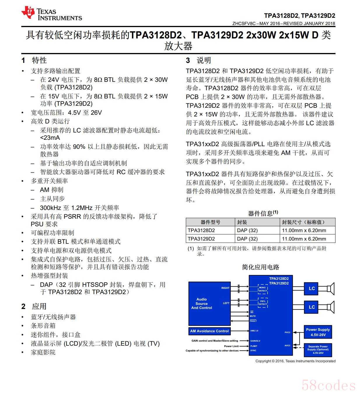 TI德州仪器TPA3128D2是具有低空闲功率损耗的双通道30W差分模拟输入D类放大器,具有延长蓝牙/无线扬声器和其他电池供电音频系统的电池寿命的特点,支持4.5-26V工作电压,支持可编程的功率限制。