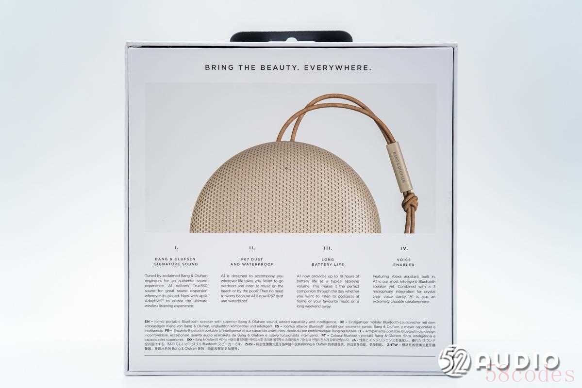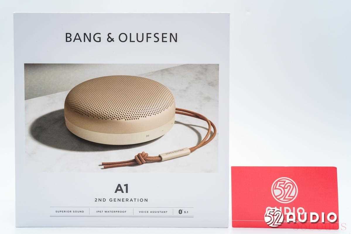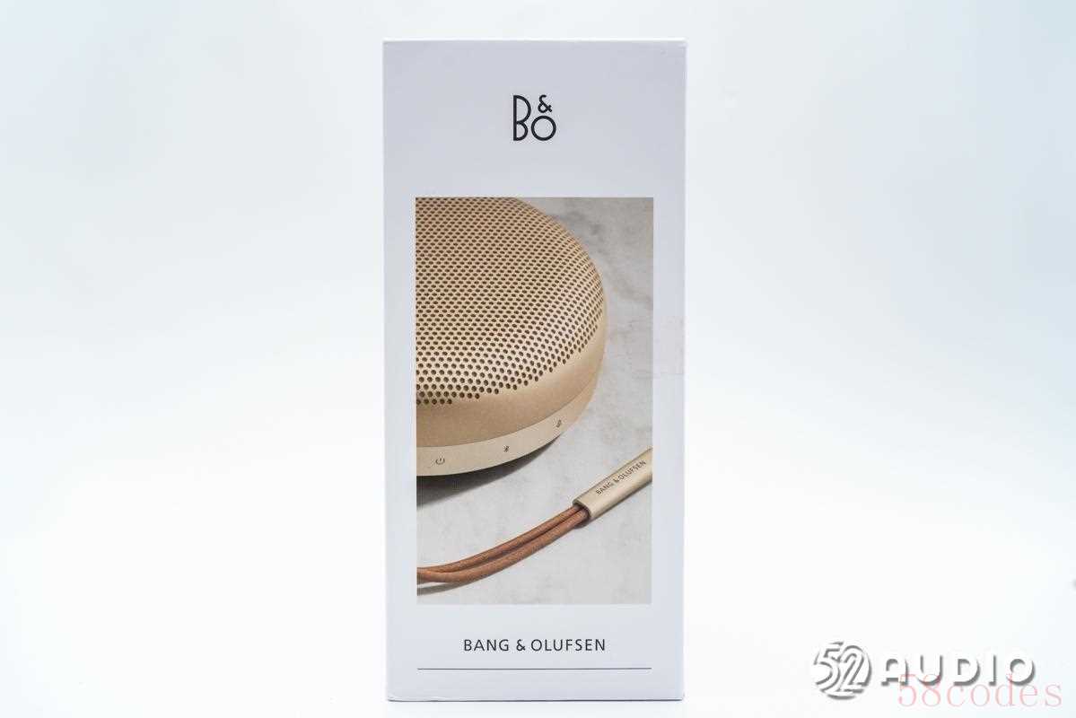 B&O A1 GEN2蓝牙音箱包装盒正面展示有产品外观场景图,品牌名称和产品名称,以及多项产品功能特点。