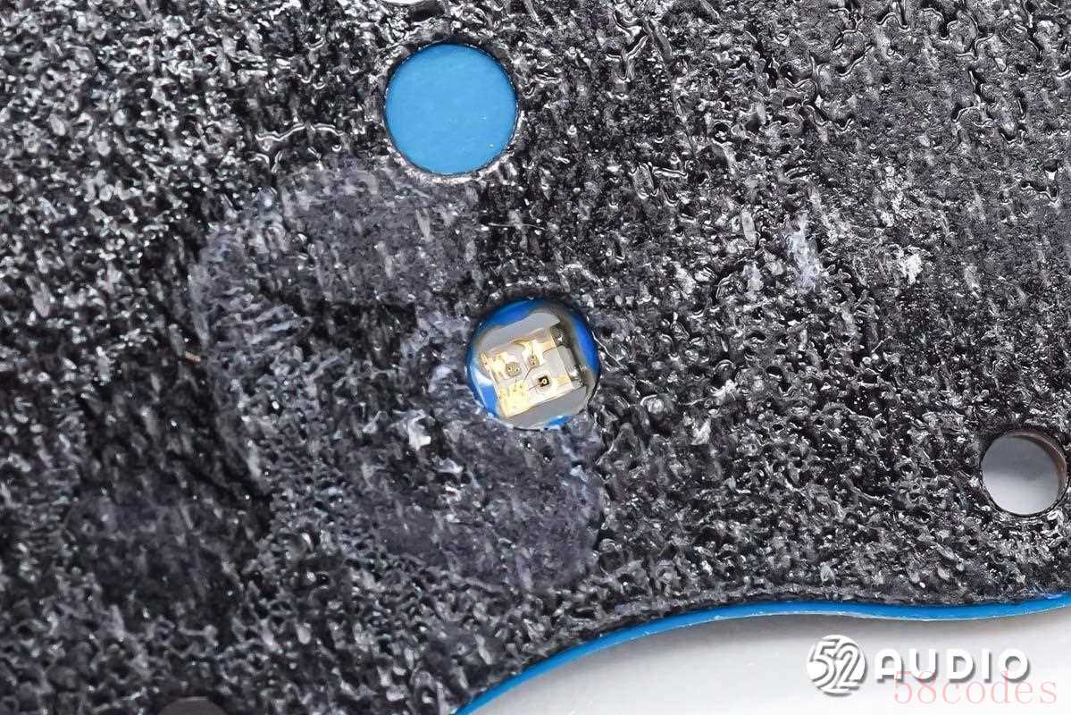 音箱指示灯导光柱特写,设置有海绵垫密封,防止漏光。