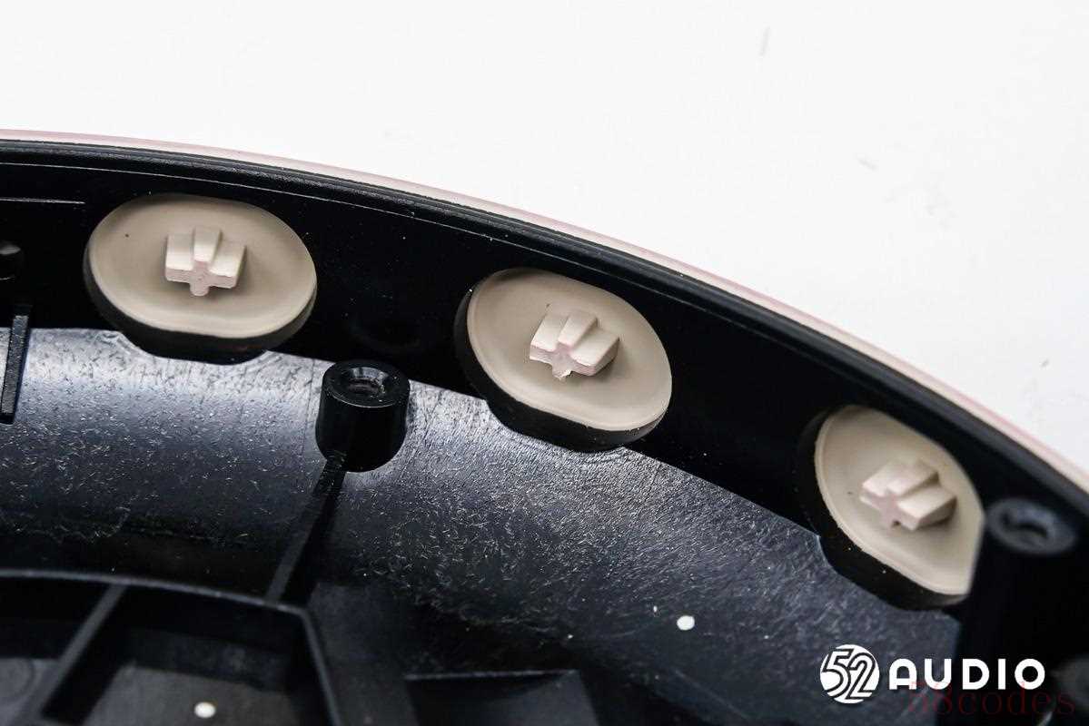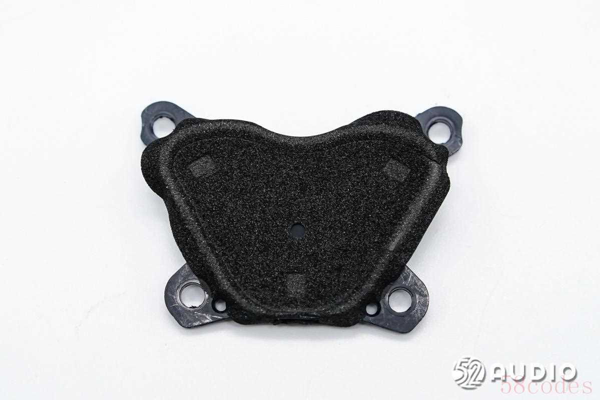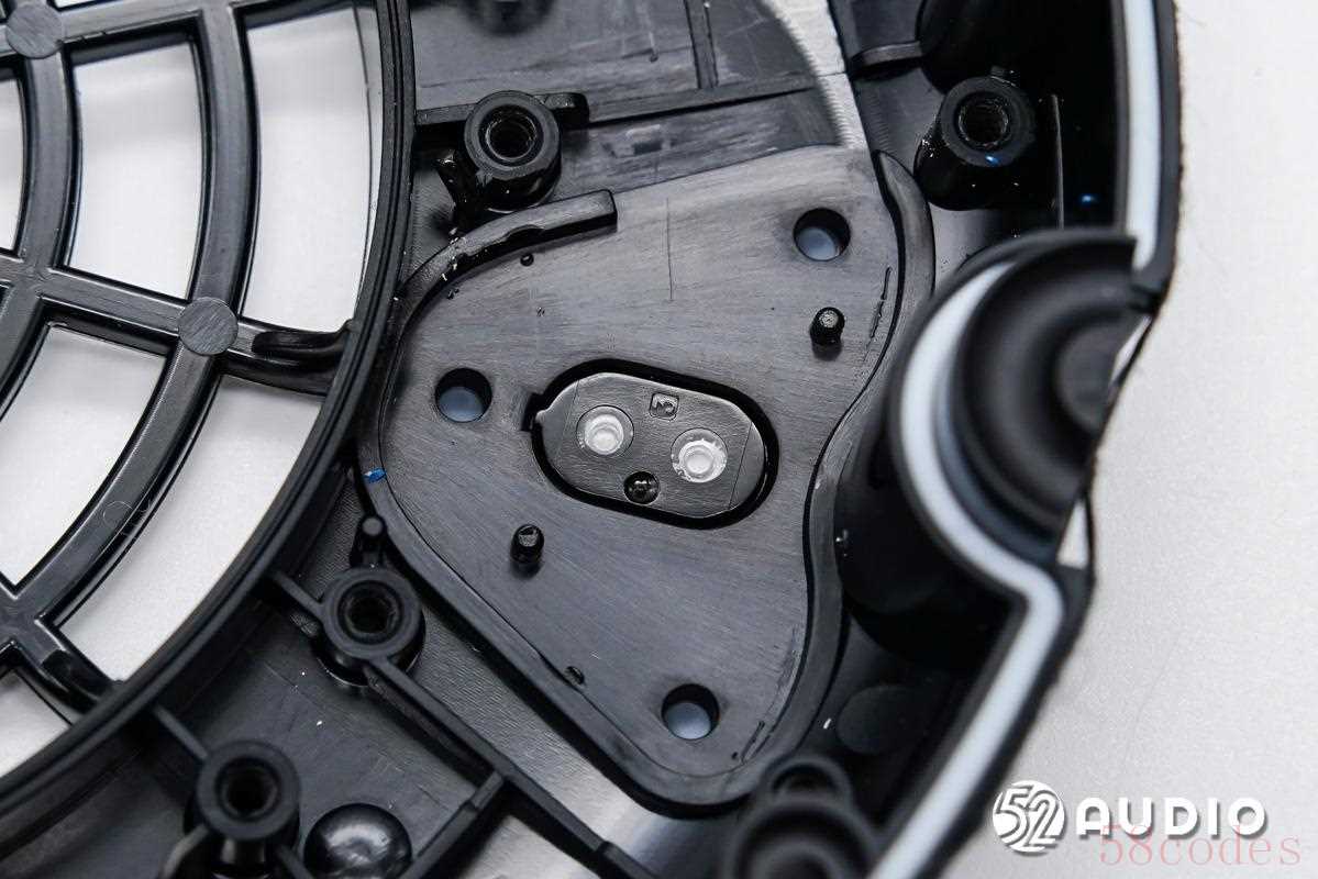 前腔内部结构一览,固定两颗扬声器和麦克风小板,腔体边缘设置有橡胶垫密封。