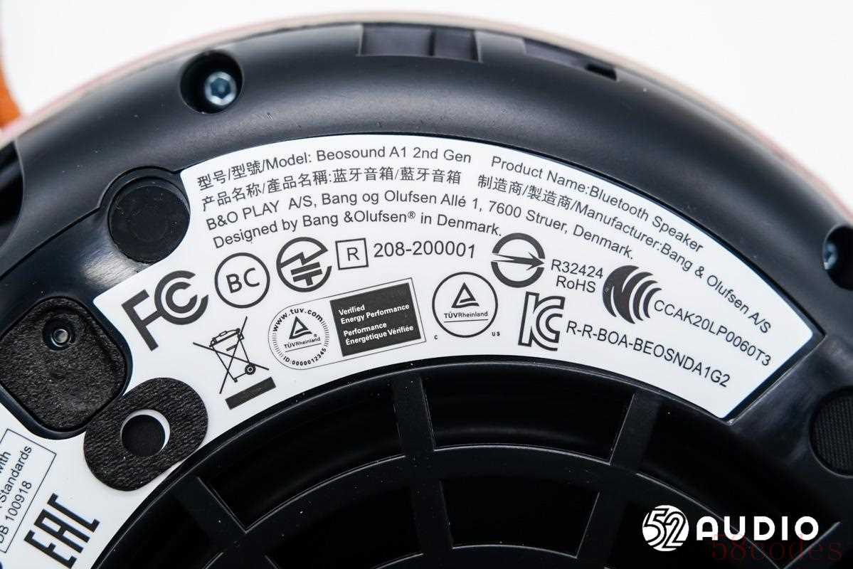 盖板上贴有产品的部分介绍信息,型号:B&O A1 2nd GEN,产品名称:蓝牙音箱,输入:5V-3A,制造商:BANG & OLUFSEN,以及各种认证标识等。