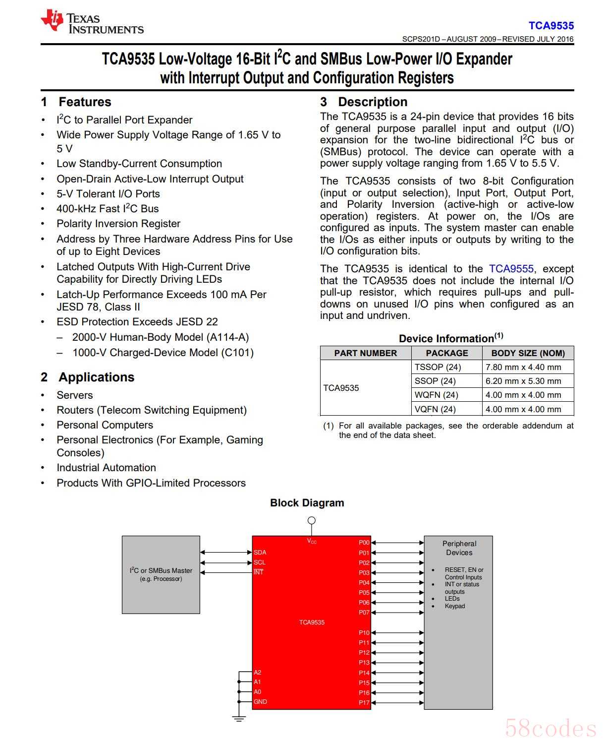 TI德州仪器TCA9535是一款24引脚器件,可为两线双向I2C总线或 (SMBus) 协议提供16位通用并行输入和输出 (I/O) 扩展。该器件可在1.65V至5.5V的电源电压范围内工作。