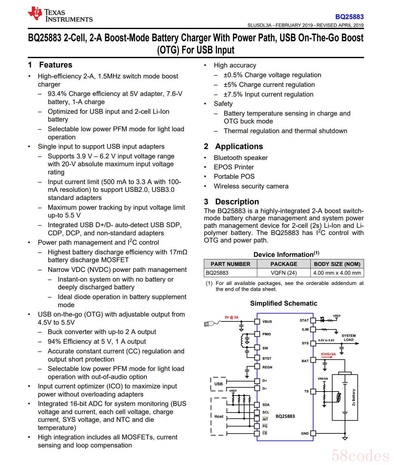 TI德州仪器BQ25883充电IC,是高度集成的2A升压开关模式电池充电管理和系统电源路径管理器件,适用于两节 (2s) 锂离子电池和锂聚合物电池。BQ25883具有I2C控制、OTG和电源路径功能。