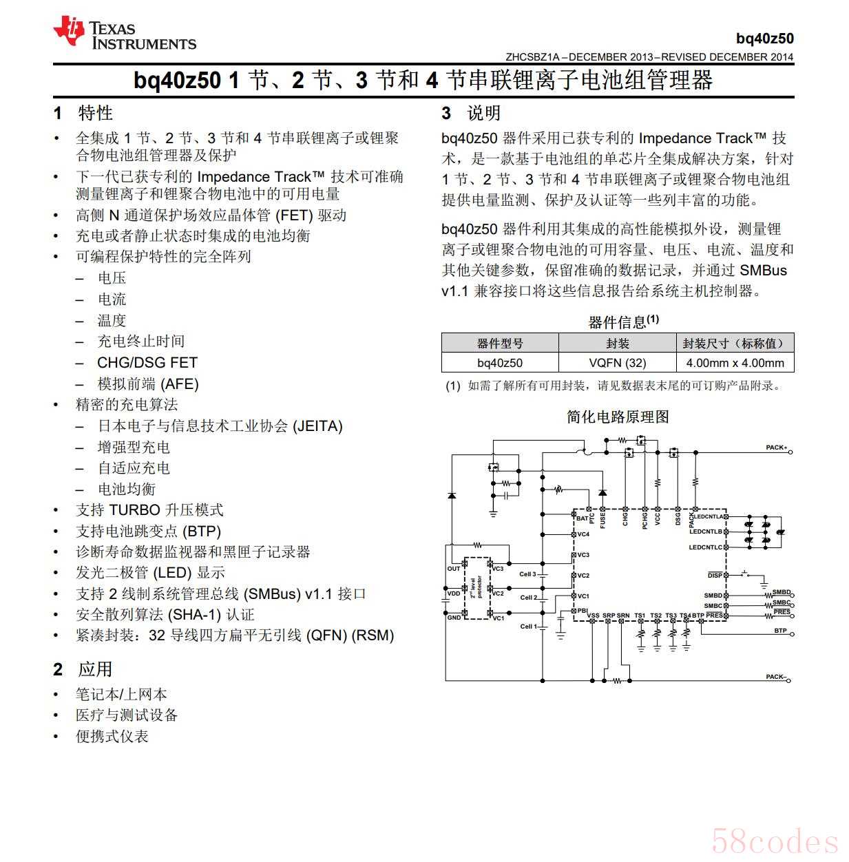 TI德州仪器BQ40Z50电池组管理器,采用Impedance Track™ 专利技术,是一款基于电池组的单芯片全集成解决方案,针对1 节、2 节、3 节和 4 节串联锂离子或锂聚合物电池组提供电量监测、保护及认证等一系列丰富的功能。
