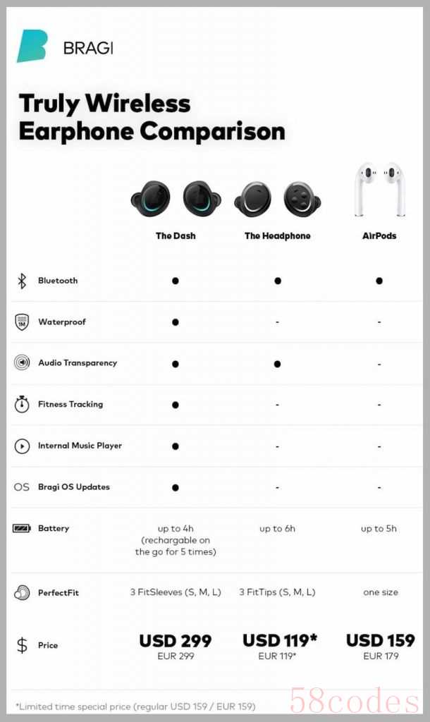 威锋网讯,作为最近几个月来风头较劲的无线耳机厂商,Bragi 的动作可谓不小。近日该厂商就用旗下的两款产品,The Dash 以及 The Headphone,和苹果新发布的 AirPods 进行了对比。