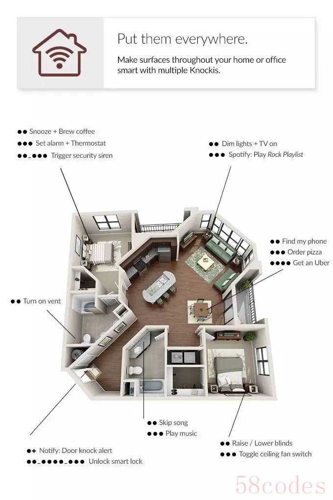 Knocki是一款可以把任何表面都变成智能遥控器的设备,用户可以通过敲击来对家中的智能设备进行控制,比如智能灯和咖啡机等等。一整面墙、桌面或者橱柜表面都可以变成控制面。