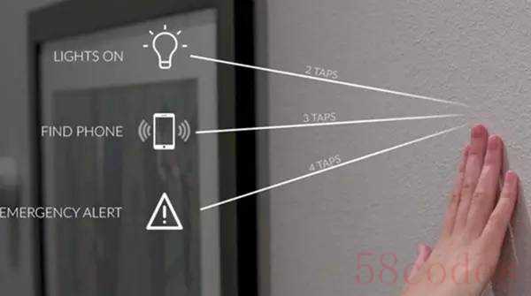 当用户将 Knocki 固定在墙上、床头柜上或者桌子上的时候,其内部的加速度计就能够感知到用户在这些物体表面上的敲击,不仅如此,它还能够根据环境数据来对自身进行校准,并且能够在感知到不同的敲击方式时实现不同的功能,比如敲击两下可以开灯,敲击三下就能打开电视等等。
