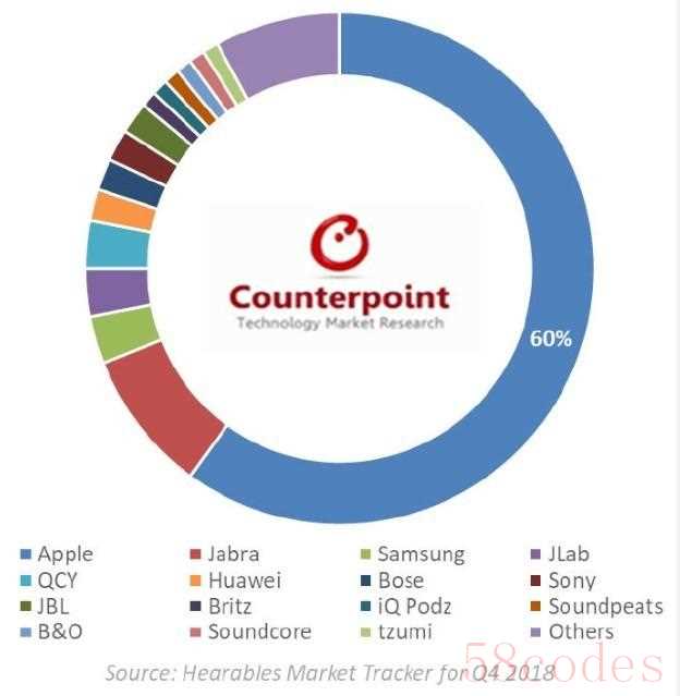 根据市研机构Strategy Analytics报告称,Apple AirPods在2019年的销售额将达到近6000万。其中真无线蓝牙耳机的销售额增长了200%。苹果在真无线耳机市场上占据了50%以上的市场,而最接近的竞争对手三星和小米的市场份额均不足10%。