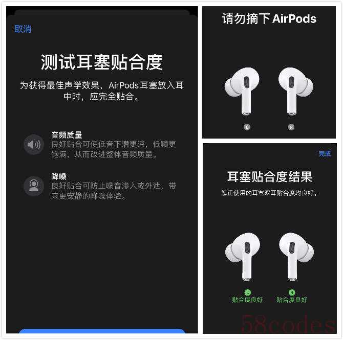 打开盒子之后,我们就能看到AirPods Pro本身了,此外苹果还提供了电源线和和三副可替换耳塞,通过可选尺寸的耳塞来实现主动降噪所需的高密合度,我们可以通过耳塞贴合度测试,挑选出合适的尺寸,获得理想的音效。