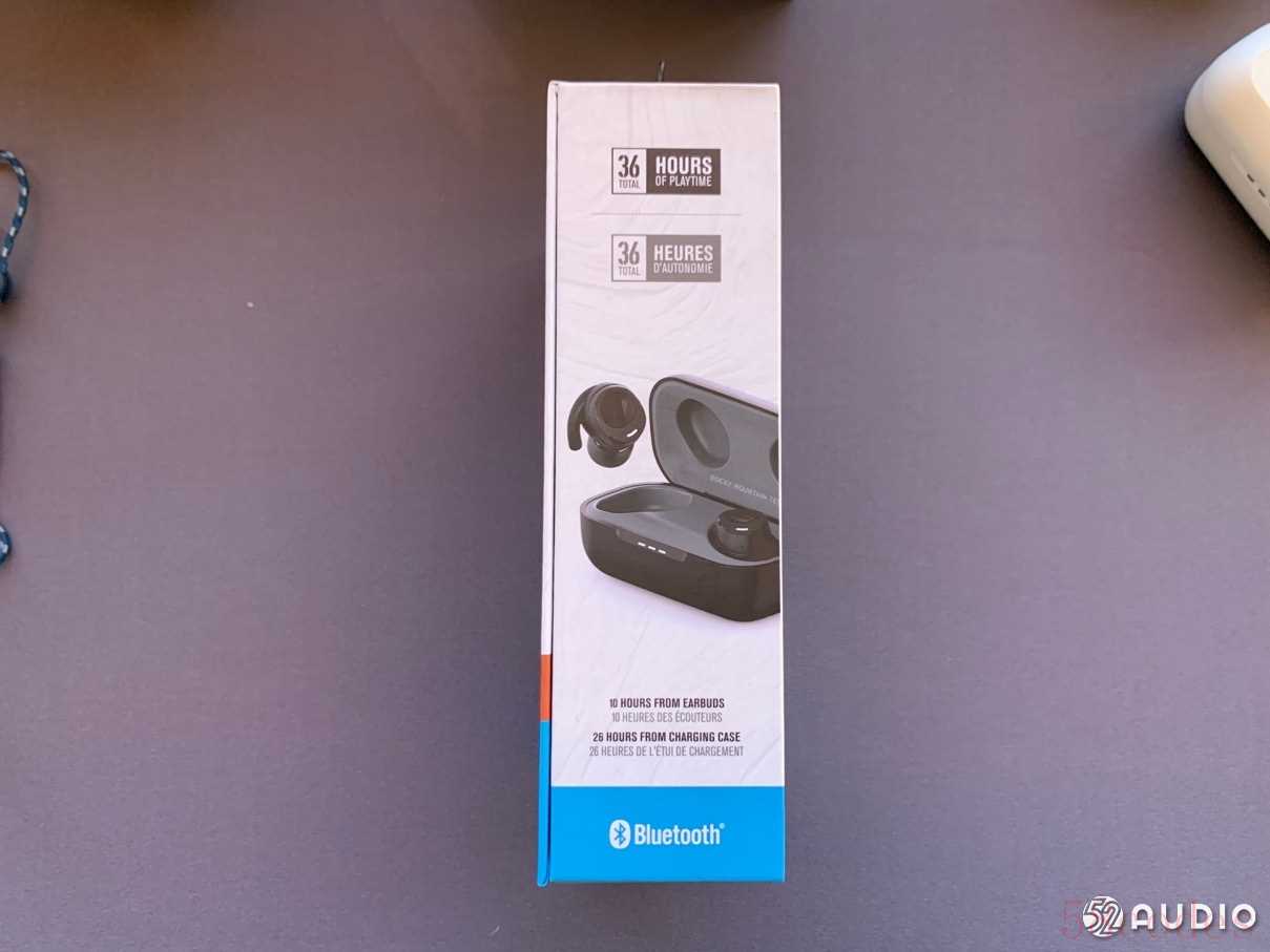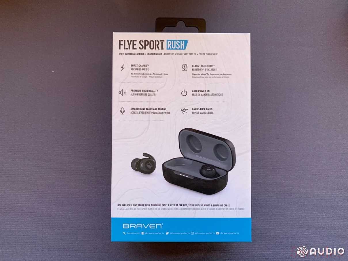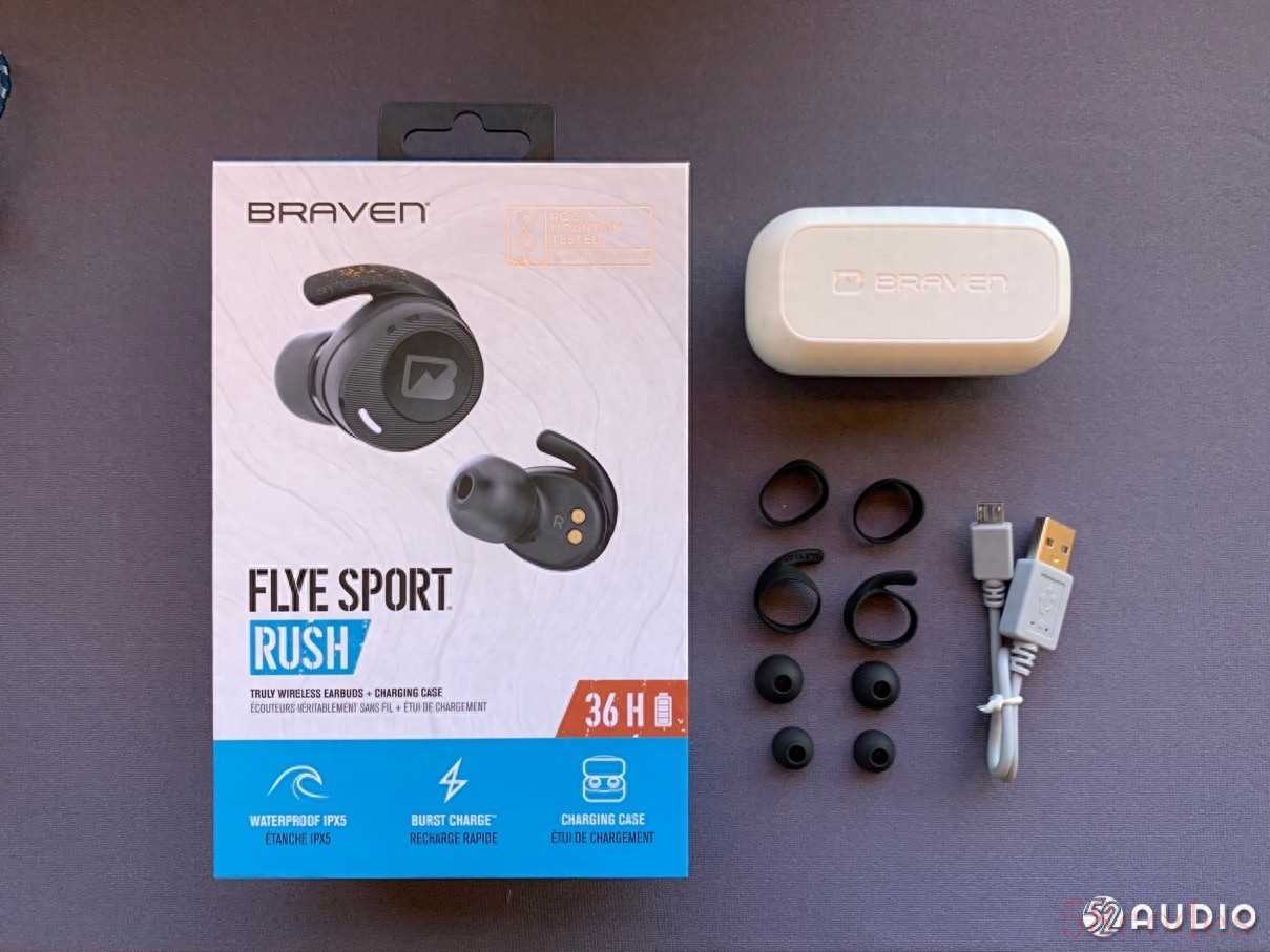 这款TWS耳机名为“Flye Sport Rush”,看来定位是一款真无线运动耳机,支持IPX5级防水,支持快速充电,与充电仓搭配续航可达36小时。包装内的配件有两对耳挂和两副耳塞,以及充电线。