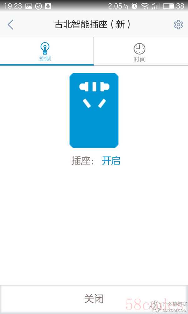 连接成功后显示的界面。简简单单两个选项,一个就是控制开关,一个就是定时开关,再就是右上角的设置图标,点进去后,显示: