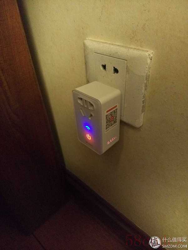 这是第一次插上之后的效果。背部的两个指示灯亮起,橙色的电源灯在开启状态为常亮,蓝色信号灯为频闪状态(这个状态也是待连接状态),如果长时间手机端不与插座连接,则信号灯不再频闪。侧面的二维码也是用来连接手机端的,后面再说。