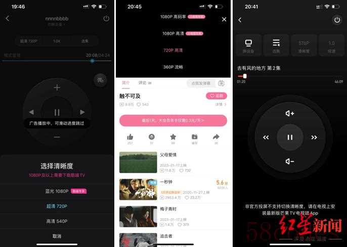 红星新闻记者通过实际操作发现,目前几乎所有的主流长视频App都对低级别会员有投屏清晰度限制。芒果TV普通会员仅支持576P清晰度投屏;优酷普通会员仅支持720P清晰度投屏,部分热门剧集则直接禁止投屏,只能试看6分钟;B站普通会员也仅支持720P清晰度投屏;腾讯普通会员最高支持1080P清晰度投屏。
