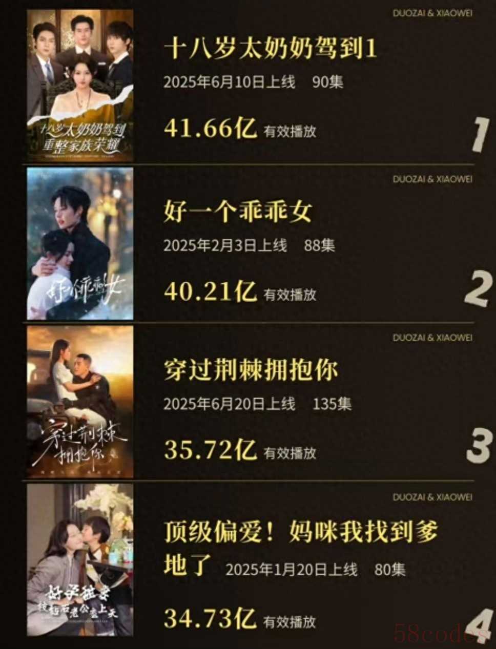 分账模式重构了产业链利益分配,让制作方与平台绑定共赢。免费时代下,剧方收入从用户充值转向平台分账,核心参考用户观看时长、播放量、拉新率等指标 。红果、芒果TV等平台推出阶梯分账与保底协议,爆款短剧单月分账可达千万元,即便普通剧集也能获得基础保障。2025年春节档《好一个乖乖女》分账破千万元,成为行业标杆,而当前头部爆剧分账稳定在300-400万元区间 。这种模式倒逼行业向精品化转型,IP续集层出不穷,《十八岁太奶奶驾到》系列已拍到第四部,人均观看时长超60分钟。