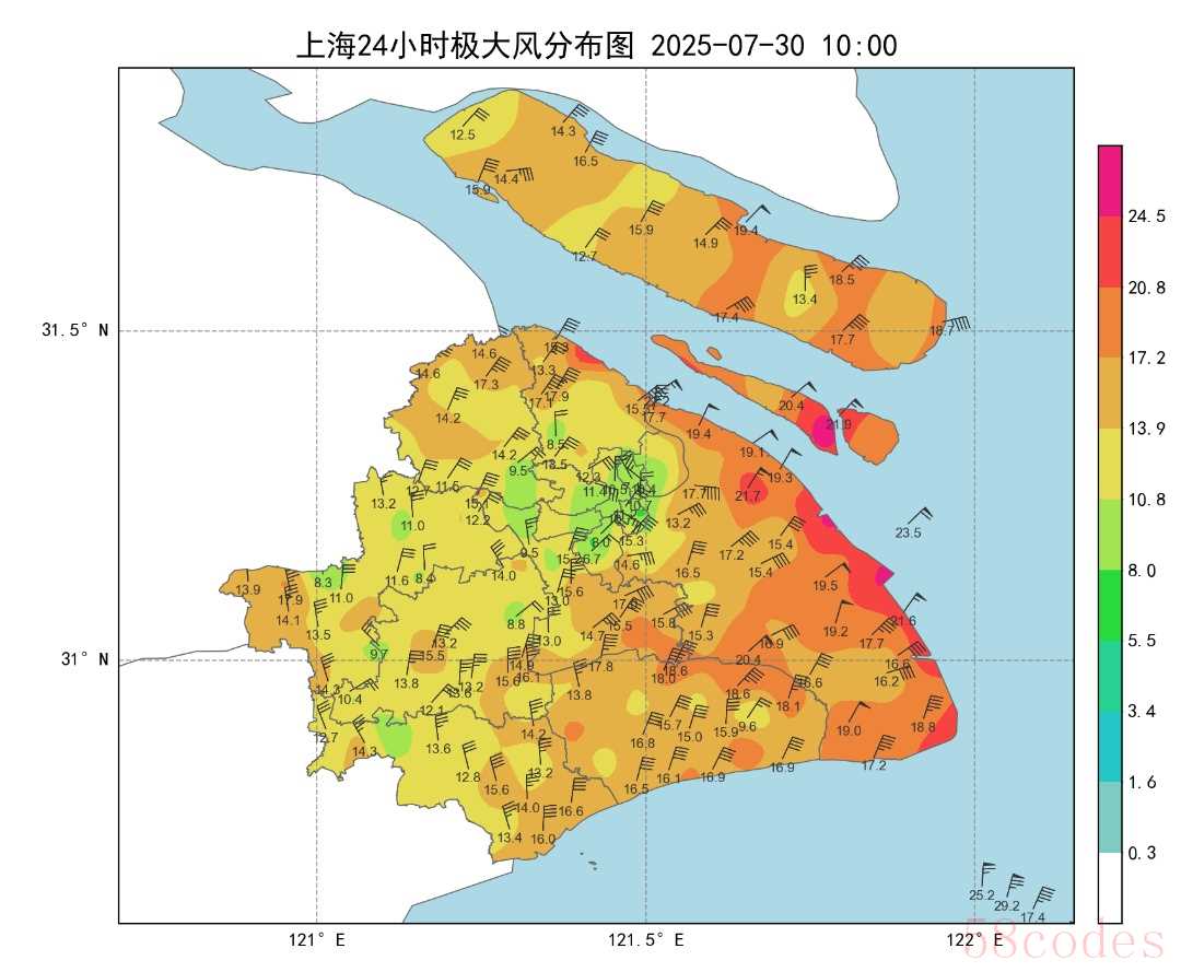 气象数据统计显示,昨天(29日)20时至今天10时,本市有半数地区出现暴雨,其中以奉贤青村镇115.5毫米为最大。陆上半数地区出现最大6级以上阵风,其中以浦东祝桥镇10级(24.6米/秒)为最大。