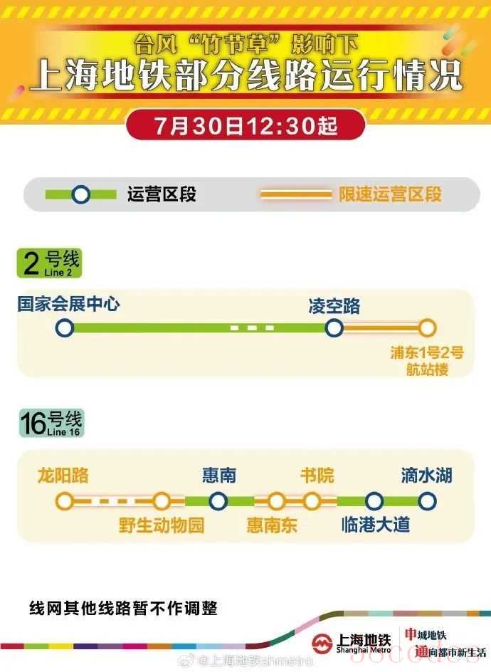 受台风“竹节草”影响,为确保轨道交通运营安全,今日(7月30日)12时30分起,【2号线浦东1号2号航站楼站至凌空路站】,以及【16号线地面高架段】列车限速运行,提醒乘客注意!