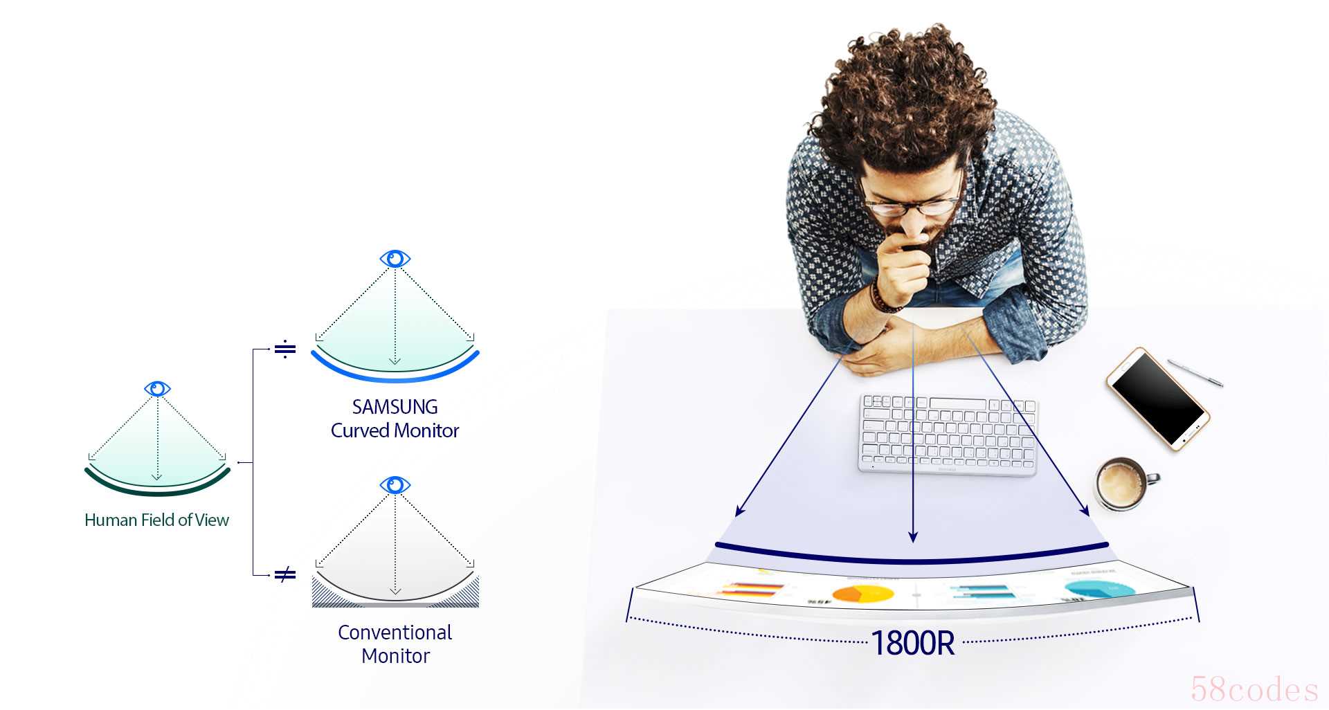 曲面显示器的屏幕弯曲成弧形,通常是为了让用户的眼睛更自然地聚焦在屏幕中心,减少长时间观看时的视觉疲劳。此外,曲面设计还可以让屏幕看起来更大,从而增强观看体验。
