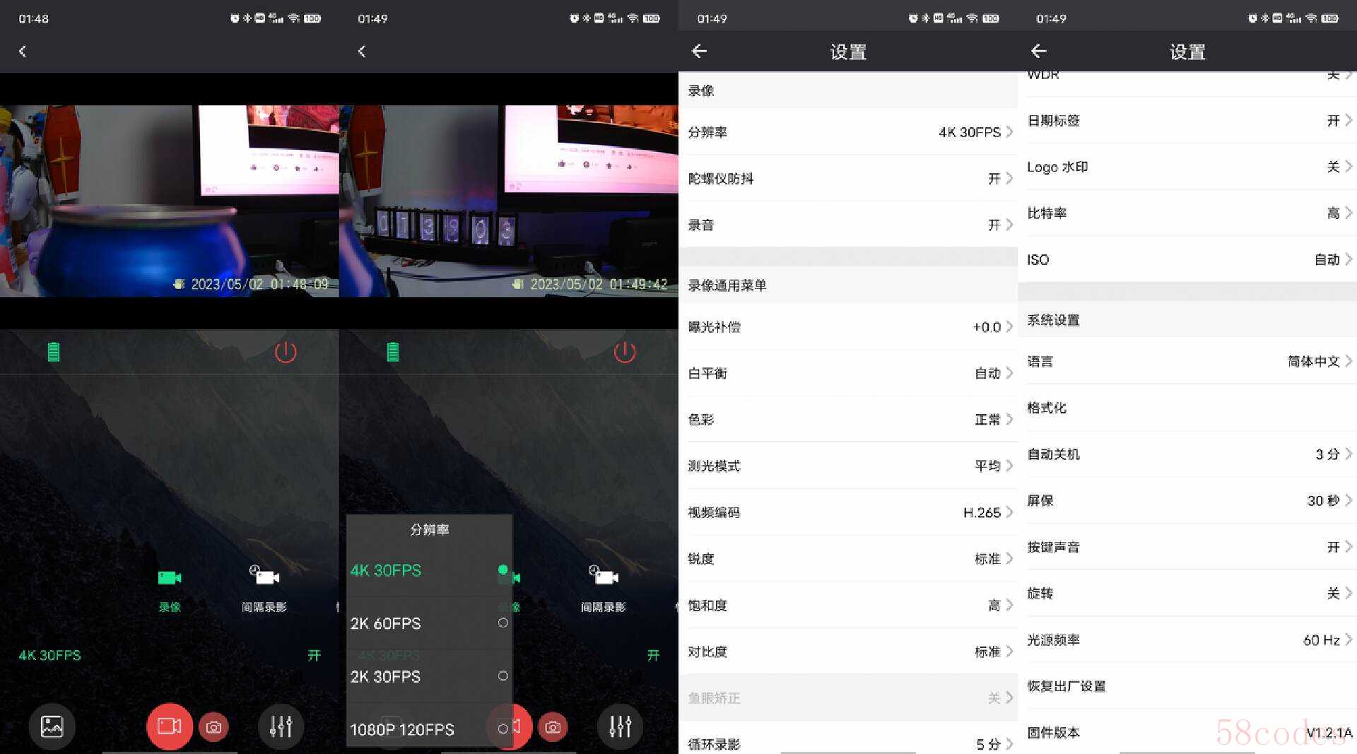 屏幕下方的左侧菜单是开启当前模式下的设置,比如摄像模式可以选择4K 30fps、2K 60fps、2K 30fps、1080P 120fps、1080P 60fps等分辨率的选择。