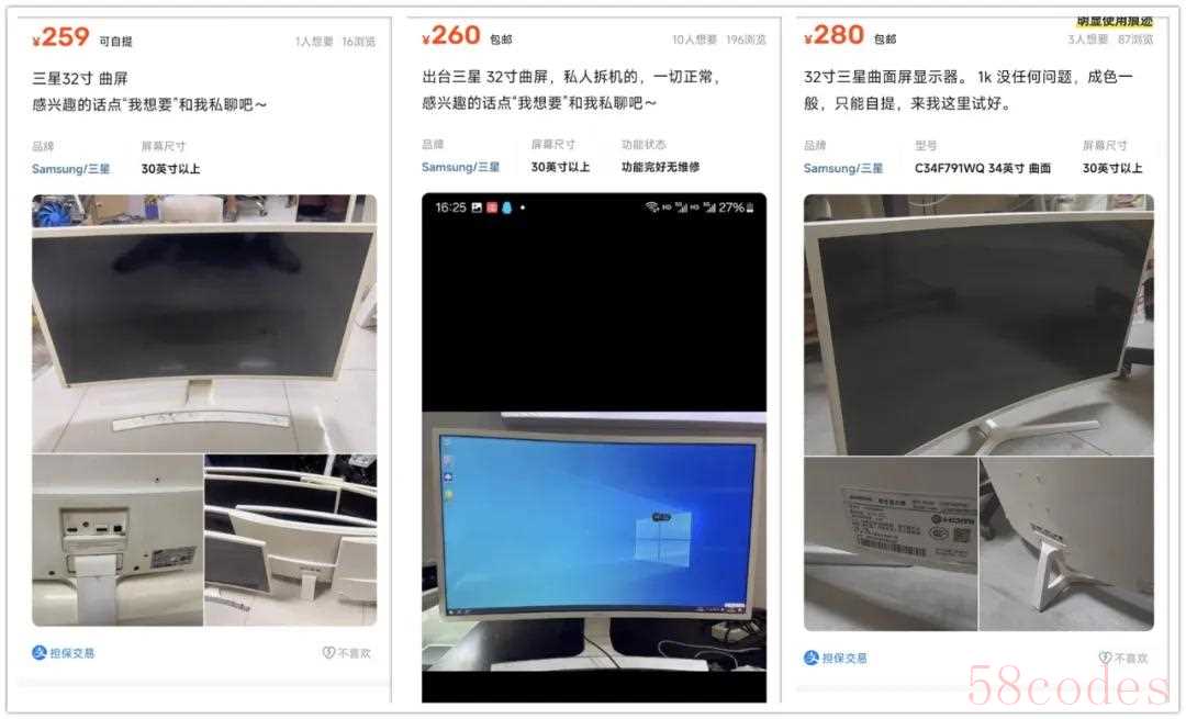 至于价格,大多数卖家不写型号,通常只写“品牌+尺寸+曲面”这三个关键词,合理价格区间是259-280元,本地自取最好,外地加邮费尽量控制在300元以内。三星还有另一款32寸曲屏C32R500FHC的参数一样,可纳入备选。