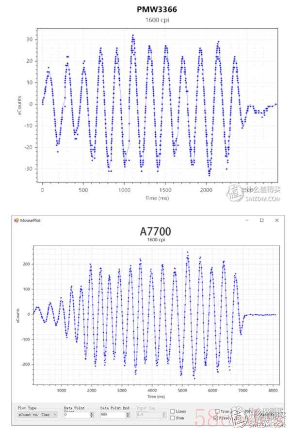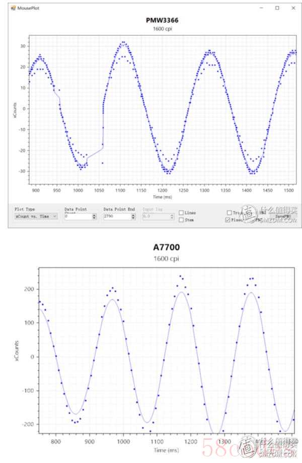▲上图分包是用mousetester测出的PMW3366(1600dpi/1000Hz)与A7700(1600DPI/125Hz)的X轴坐标反馈。从上面的宏观图上看,两款引擎都的反馈点都很符合算法轨迹曲线,但是我们将曲线放大。