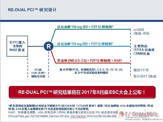 2周后,2017年欧洲心脏病学会(ESC)年会就要召开了,会上将要公布一项万众瞩目的研究:RE-DUALPCI™,该研究的目的是,对于房颤患者,在冠状动脉介入治疗(PCI)术后比较达比加群联合P2Y12抑制剂双抗,是否优于华法林联合双联抗血小板治疗?