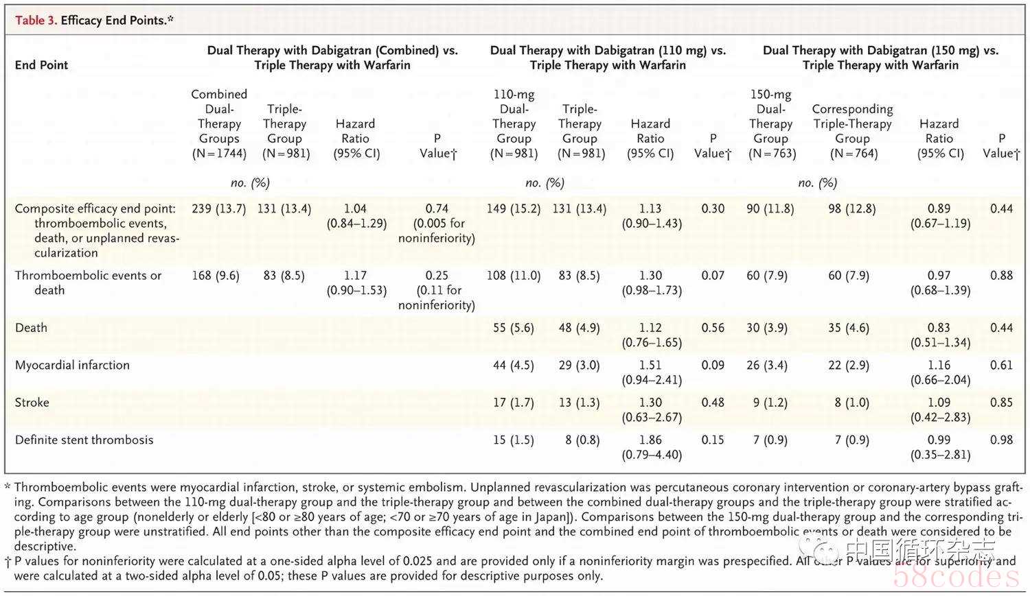 达比加群酯110 mg和150 mg双联治疗组的主要安全性终点风险分别比华法林三联治疗组降低48%和28%(相对差异),总血栓栓塞事件的发生率相似。